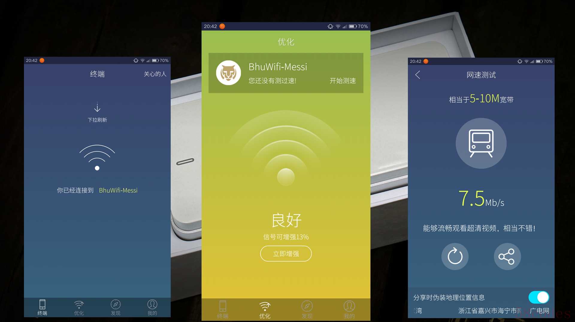 必虎路由的操作界面很简洁,通过切换下方工具栏功能,可实现不同功能,优化的“信号增强”很神奇,不知道怎么一键提速的,测速很准,还能反映家庭的网络运营商和GPS地址定位。