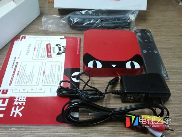 打开天猫魔盒的包装后,你可以看到有以下几个配件:天猫魔盒,HDMI线,AV线,电源适配器,遥控器,遥控器电池 等。