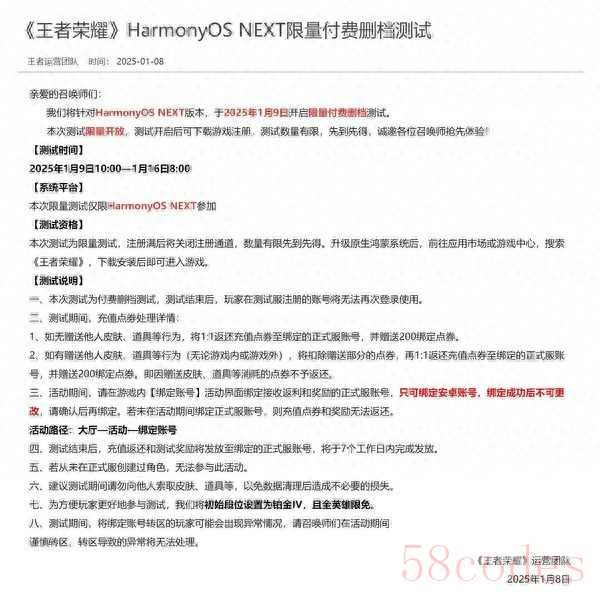 本次测试限量开放,测试开启后可下载游戏注册,测试数量有限,先到先得。注册满后将关闭注册通道,升级原生鸿蒙系统后,前往华为应用市场或游戏中心,搜索《王者荣耀》,下载安装后即可进入游戏。需要注意的是,本次测试为付费删档测试,测试结束后,账号将无法登录使用。如果在测试期间充值了点券,将1:1返还充值点至绑定的正式服账号,并赠送200绑定点券。