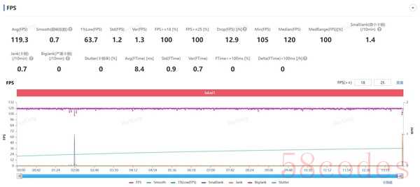 可能是由于新号的缘故,所以在游戏内一局时间基本上10分钟左右就结束了,我们进行了多轮对局,总时长差不多在1小时左右。选取了时长在10几分钟的一局游戏帧率来做展示。华为Mate70 RS非凡大师平均帧率可以达到119.3帧,游戏全局帧率无明显波动,表现相当出色。在多局游戏中,华为Mate70 RS非凡大师都能做到帧率稳定在119+,对于游戏党来说这无异于是一个好消息。