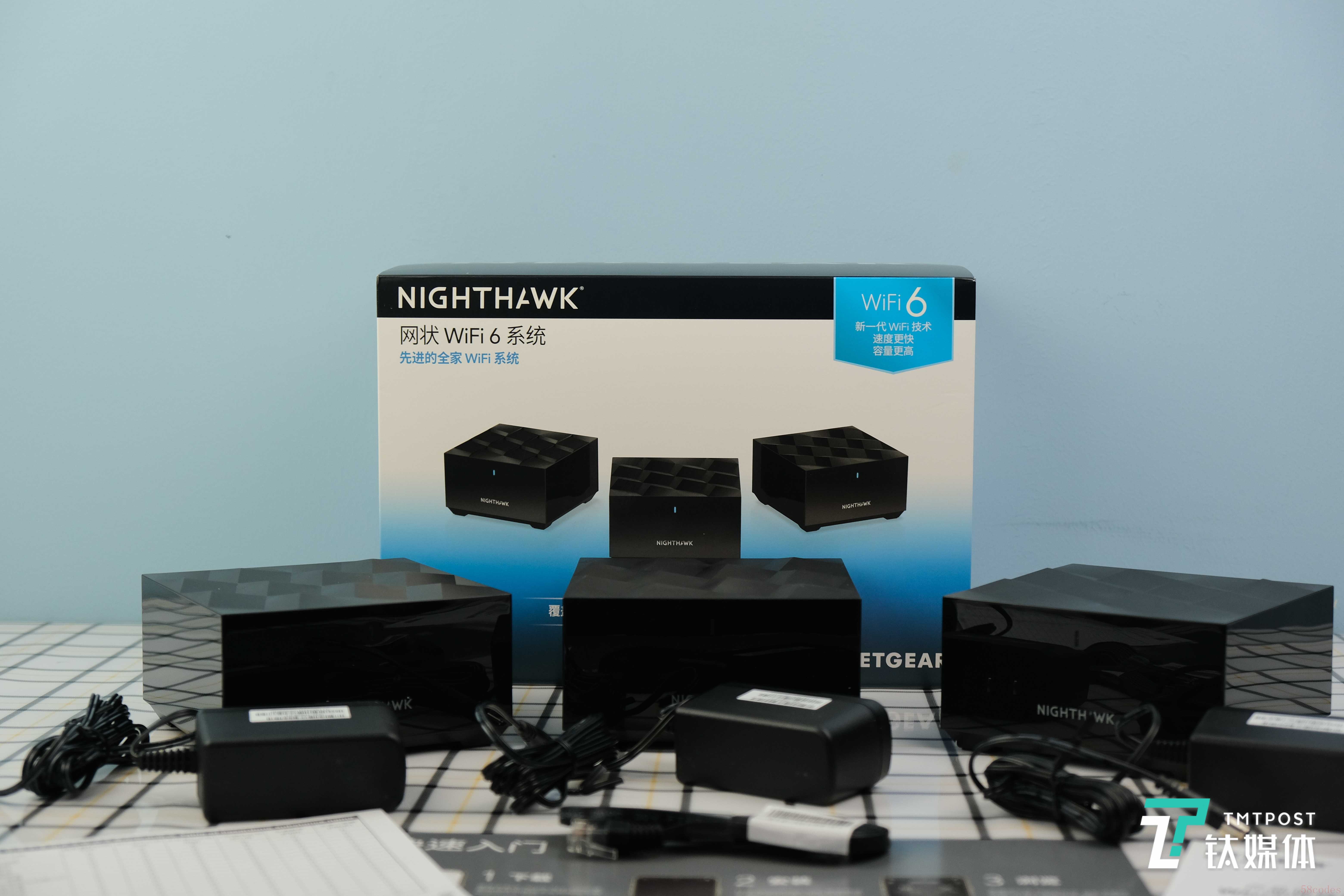 这套系统属于网件旗下的夜鹰(Night Hawk)产品线,它拥有一个主机和两个用于拓展的子路由。纸盒包装之内,除了产品本体之外,就只有附赠的一根网线、三个电源适配器以及入门指南和产品保修卡。
