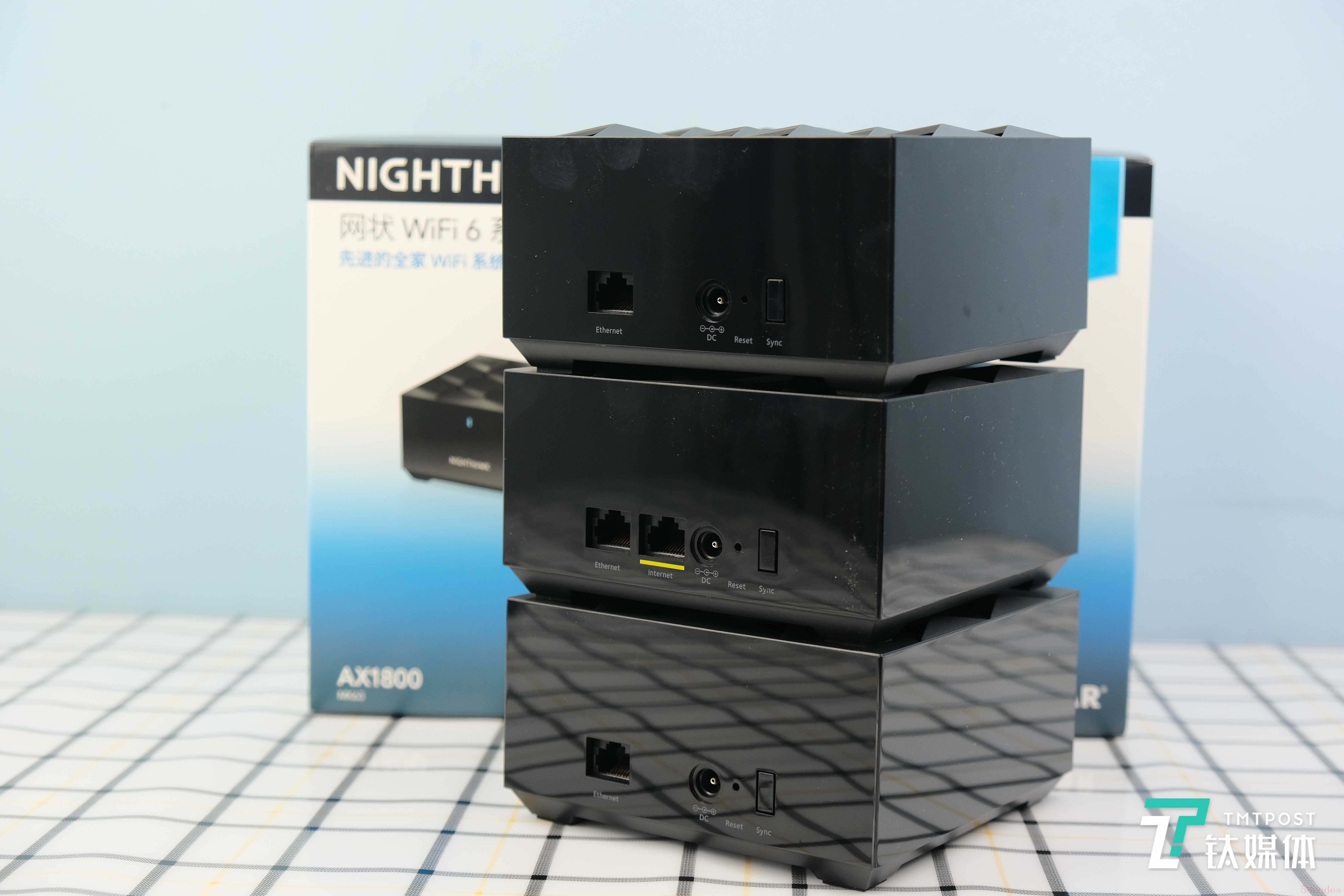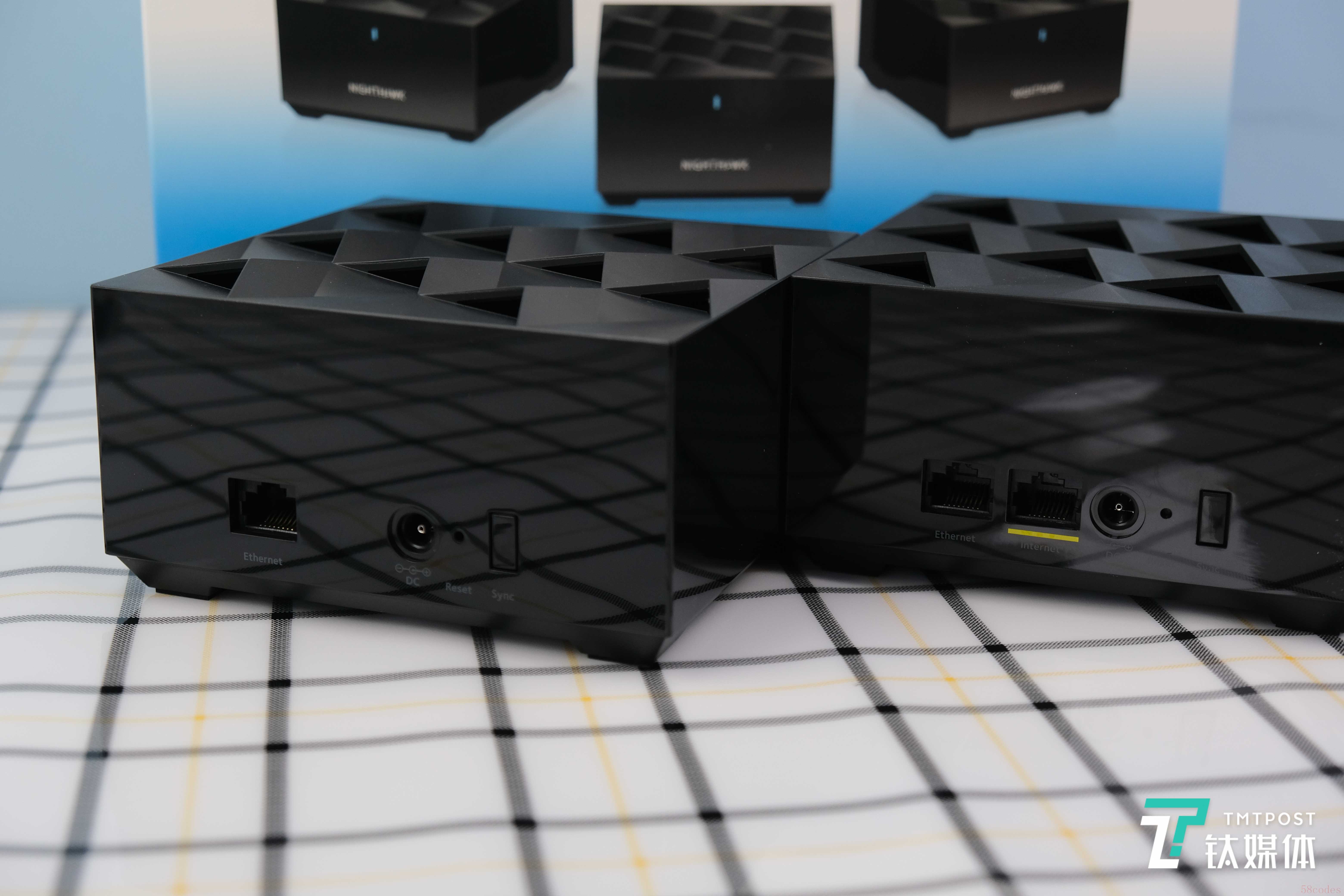正面设计也是如此——除了NightHawk字样之外,也就只有一颗LED灯,用来展示当前设备的运行状态。所有接口按键都集中在产品背部。其中包括有线网口、电源接口、重置按键和同步按键,主机有所不同的是相比副机在接口部分多了一个网络接入口。