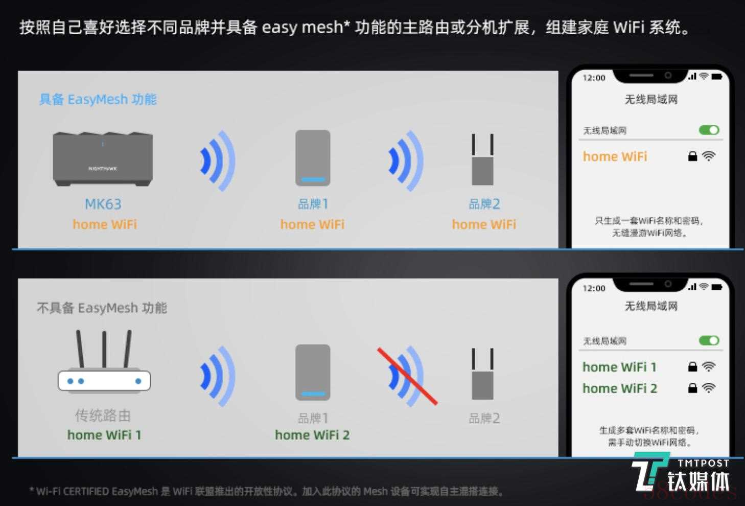 而Mesh组网的信号拓展是“双向的”,母路由与子路由之间是通过另外的特有信号频段连接,并且能够进行双向的数据交换,并不会占用到产品本身的网络带宽。这就好像是有一根看不见的网线将子母路由相连接起来。