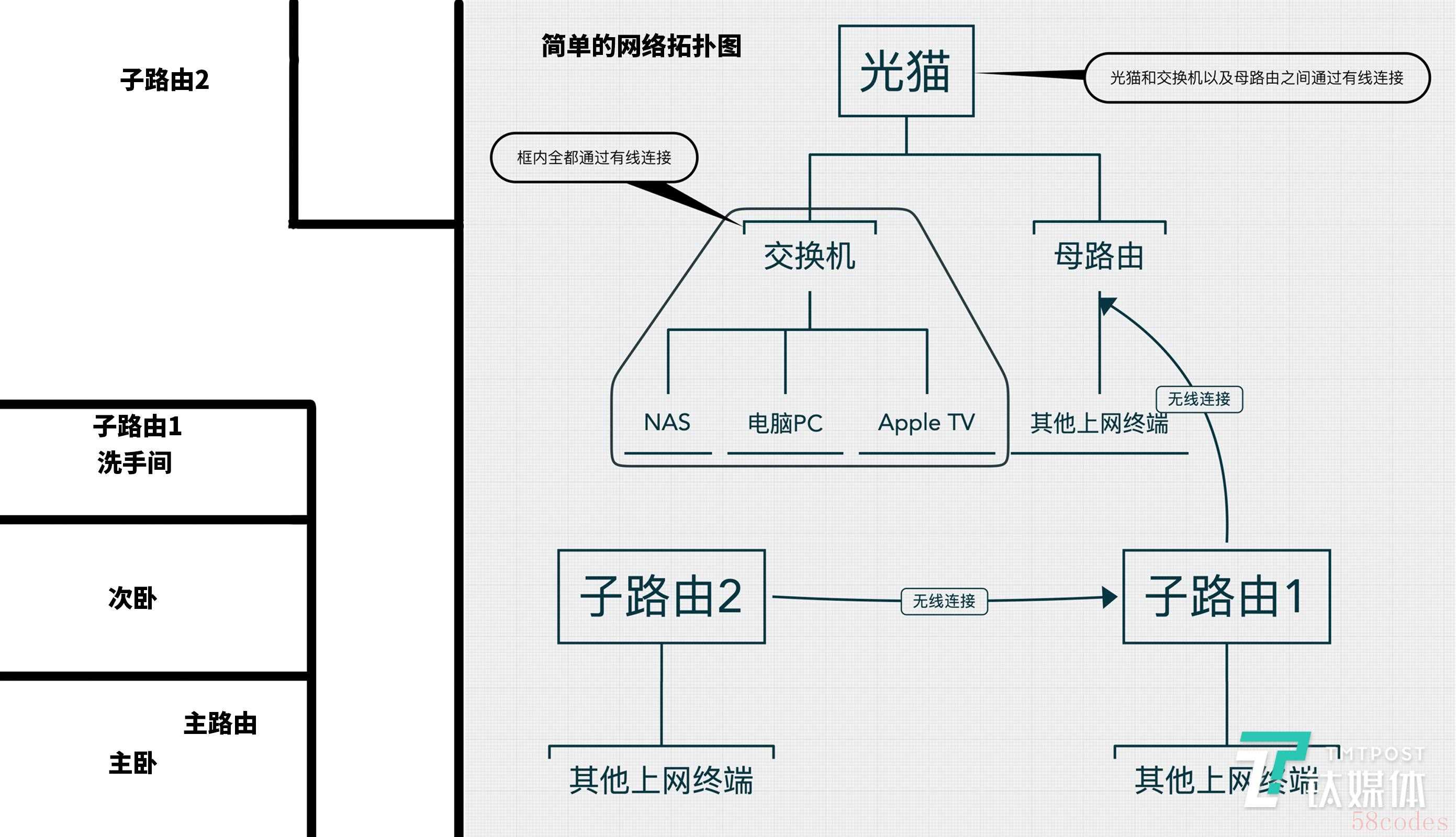 先上一张笔者家里的网络拓扑图以及三台子母路由器的排布情况: