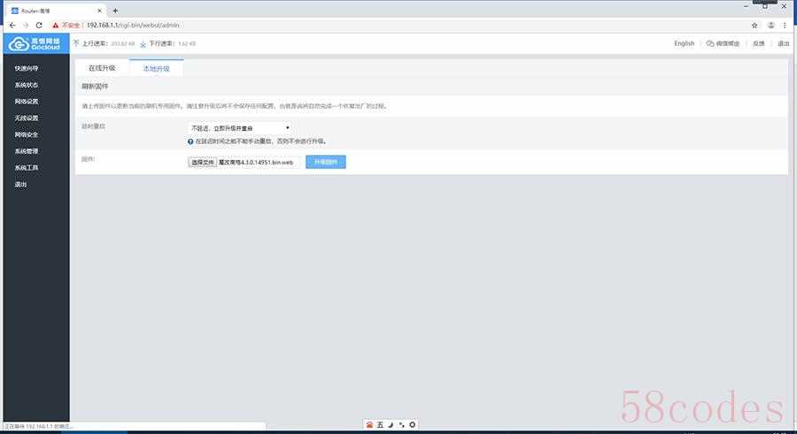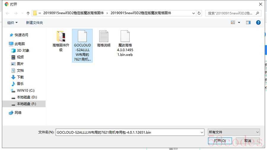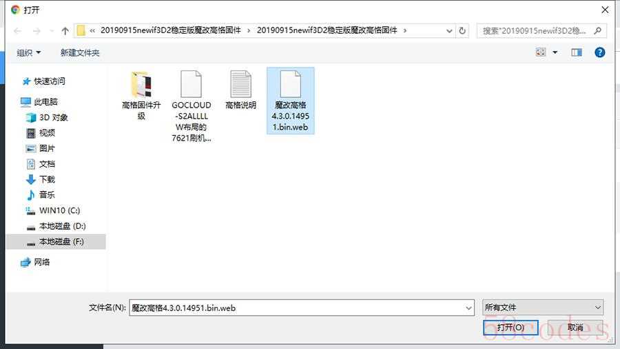 在弹出的窗口中,选择固件存放位置,选择魔改高恪这个 web 固件,点击打开。