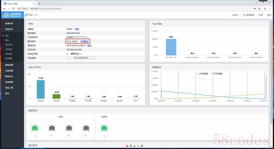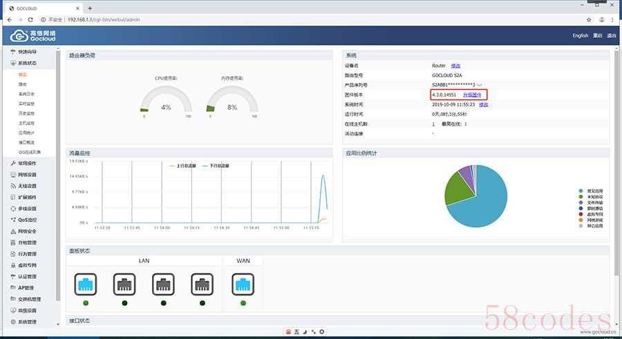 高恪魔改的系统,注意指示灯是没有进行适配的,目前只有电源灯亮着,其它指示灯均是熄灭状态,如果喜欢路由工作时指示灯闪烁的要注意这个细节。