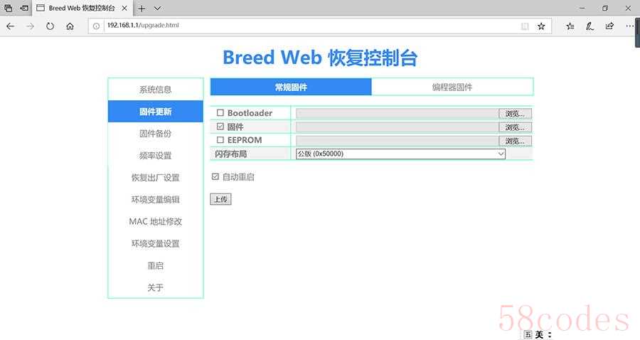 在弹出来的窗口中,选择固件存放的位置,并进行选择,高恪固件与其它固件不同,分为二个,一个为底包,在 Breed Web 恢复控制台时使用,容量只有 6.5M。一个为 web 升级包,用于本地升级。
