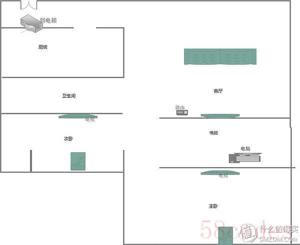 一般来说,现在的家装网线铺设就2种方式,有特殊要求的灰自己设计布局,拿我家这个布局来说: