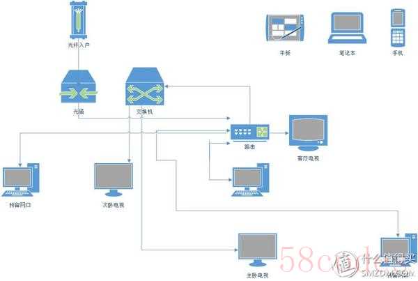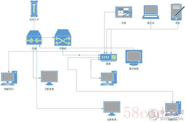 我记得电信的光猫自带路由功能的,可为什么发现不到路由下的设备呢.发现这个问题可就大了,因为我看电视基本上都是用KODI看我下载的高清,如果2者连不上对于我来说是个不能接受的大问题。我研究了半天,发现从路由接过去的客厅的电视还是正常连接电脑的,可是从交换机那里接过去的就找不到电脑,我感觉从网络设置里应该可以解决问题的,可是在网上查了半天没找到解答,这个问题纠结了我好几天,后来一想别钻牛角尖了,反正我虽然预埋了ITV需要的网线但实际没用过,我都是看本地下载的视频和网络盒子,干脆改一下,光猫出来接路由,路由接三间屋的网线,再接一根线回弱电箱接交换机,交换机出来接三个屋的电视,也就是路由作为一级,至此结束,目的全部达成,电视电脑手机平板全部互通,拓扑图如下: