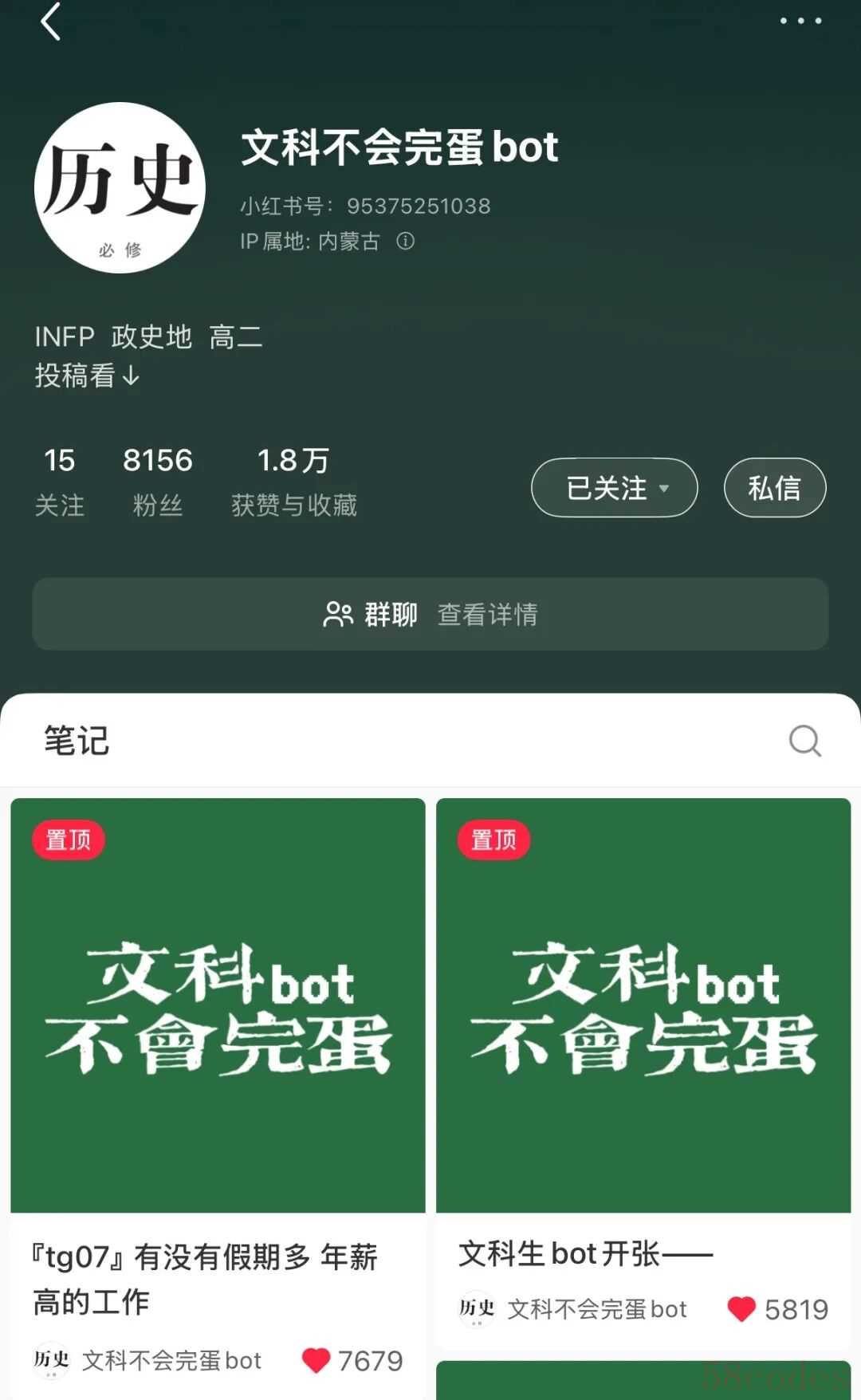“文科不会完蛋bot”一改热门的像素风,它的头像是白底黑字的“历史”二字,每篇笔记的封面图都是一张印有“文科不会完蛋bot”字样的绿色图片。