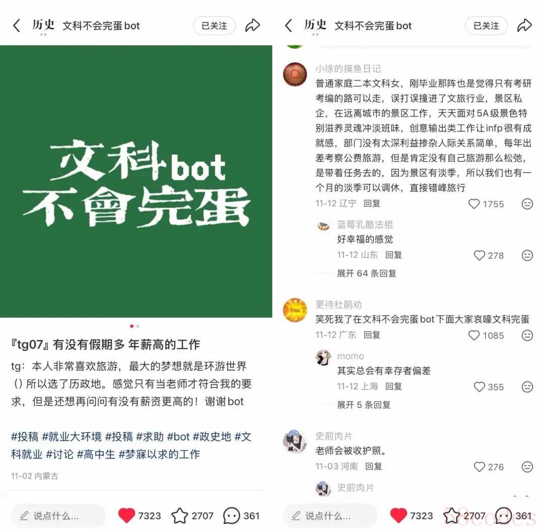 小红书不只有实用主义的好物分享类bot,还有单纯内容分享型,比如“文科不会完蛋bot”。