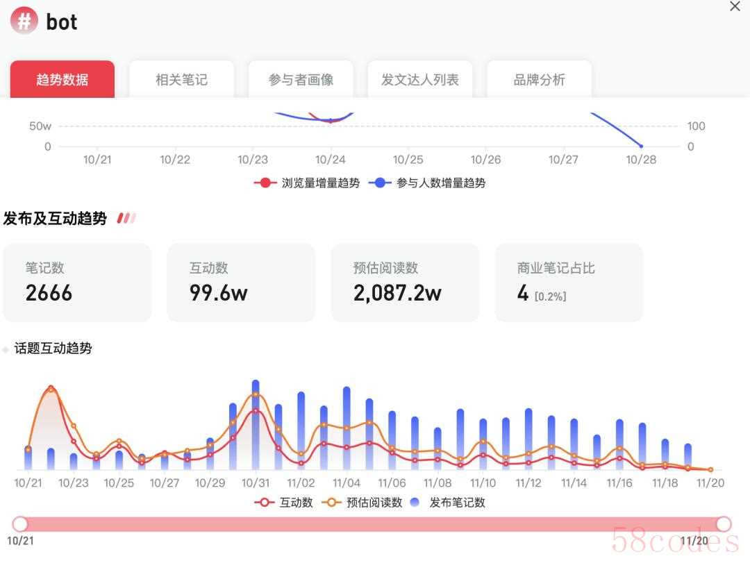 新榜旗下小红书数据工具新红显示,近30天,小红书#bot话题新增浏览增量达1204.28万次,相关笔记预估阅读数为2087.2万次。