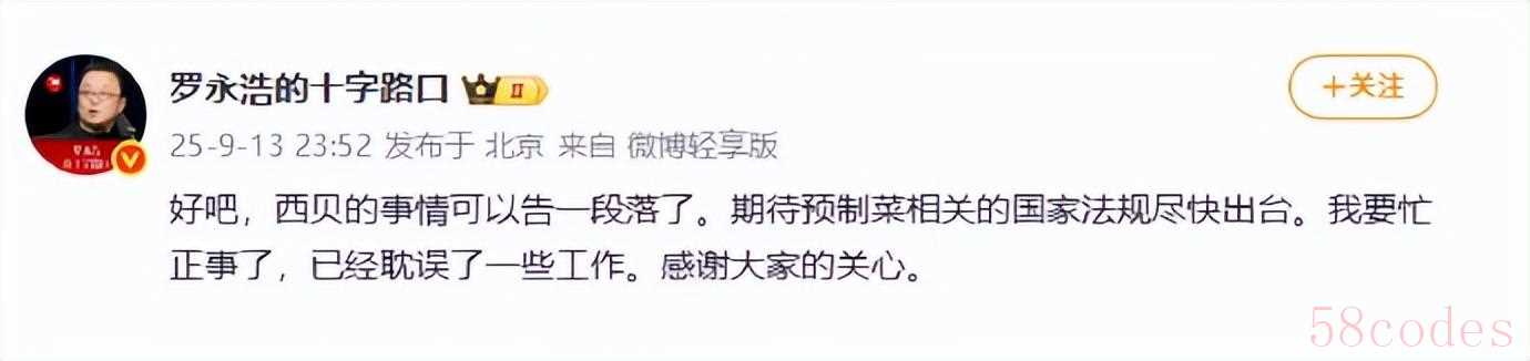 该微博引发网友围观。此前事件梳理:9月10日,知名企业家罗永浩发博吐槽知名连锁餐饮品牌西贝。其称:好久没吃西贝了,今天下飞机吃了一顿,发现几乎全都是预制菜,还那么贵,实在是太恶心了。希望国家尽早推动立法,强制饭馆注明是否用了预制菜。