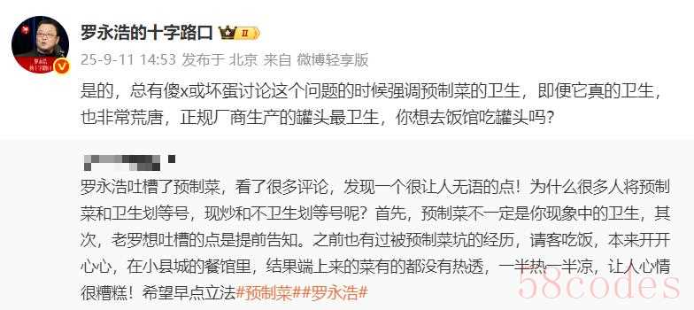 罗永浩还称:从市场经济的角度来说,预制菜贵不贵倒是没那么重要,重要的是知情权。