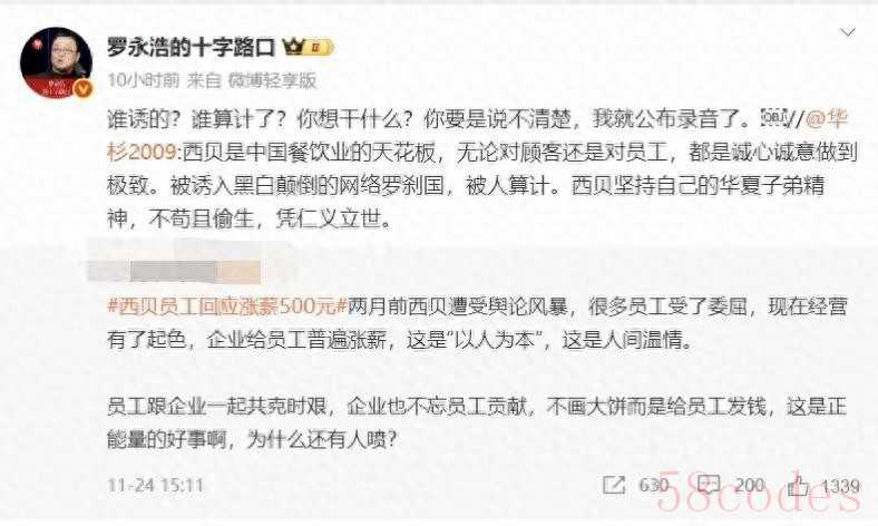 近日,华与华创始人称“西贝被算计”,他表示,西贝是中国餐饮业的天花板,无论对顾客还是对员工,都是诚心诚意做到极致。被诱入黑白颠倒的网络罗刹国,被人算计。西贝坚持自己的华夏子弟精神,不苟且偷生,凭仁义立世。随后11月26日凌晨,罗永浩转发该微博并连发三问:“谁诱的?谁算计了?你想干什么?你要是说不清楚,我就公布录音了。”
