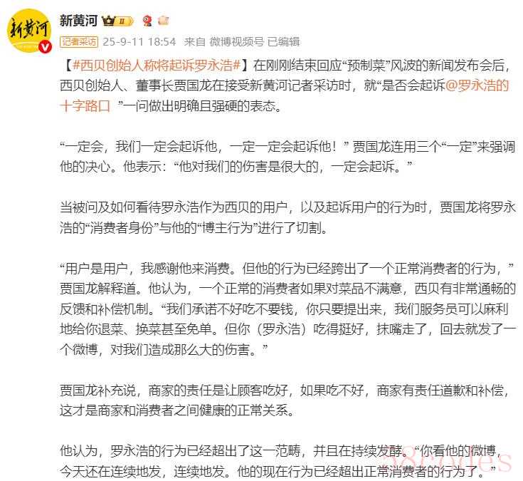贾国龙。图源:中国新闻周刊此外,贾国龙在接受新黄河记者采访时,就“是否会起诉罗永浩 ”一问做出明确且强硬的表态:“一定会,我们一定会起诉他,一定一定会起诉他!他对我们的伤害是很大的,一定会起诉。”当被问及如何看待罗永浩作为西贝的用户,以及起诉用户的行为时,贾国龙将罗永浩的“消费者身份”与他的“博主行为”进行了切割。“用户是用户,我感谢他来消费。但他的行为已经跨出了一个正常消费者的行为,”贾国龙解释道。他认为,一个正常的消费者如果对菜品不满意,西贝有非常通畅的反馈和补偿机制。“我们承诺不好吃不要钱,你只要提出来,我们服务员可以麻利地给你退菜、换菜甚至免单。但你(罗永浩)吃得挺好,抹嘴走了,回去就发了一个微博,对我们造成那么大的伤害。”贾国龙补充说,商家的责任是让顾客吃好,如果吃不好,商家有责任道歉和补偿,这才是商家和消费者之间健康的正常关系。他认为,罗永浩的行为已经超出了这一范畴,并且在持续发酵。“你看他的微博,今天还在连续地发,连续地发。他的现在行为已经超出正常消费者的行为了。”