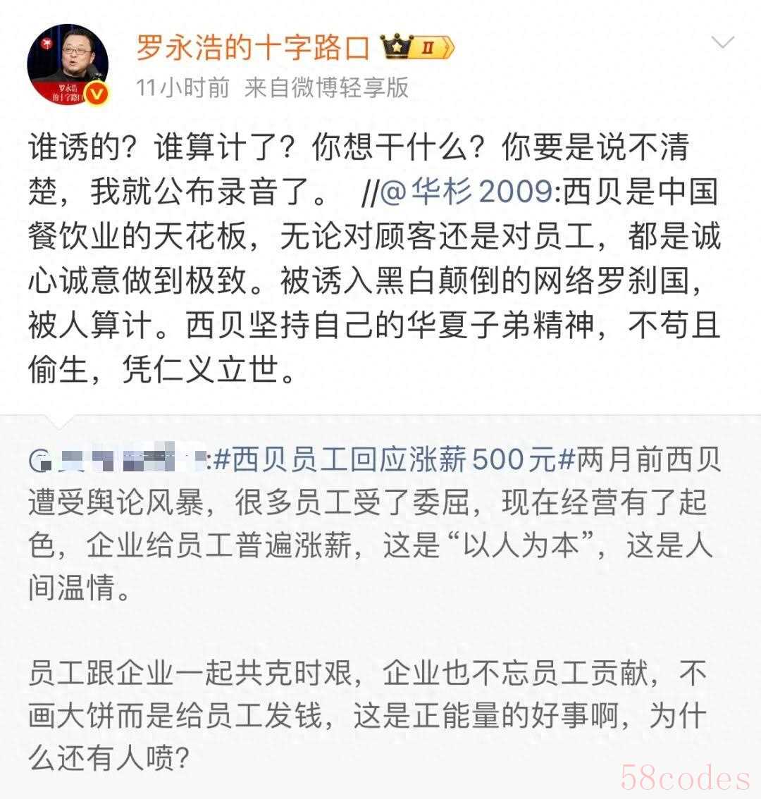 近日,华与华创始人称“西贝被算计”,他表示,西贝是中国餐饮业的天花板,无论对顾客还是对员工,都是诚心诚意做到极致。被诱入黑白颠倒的网络罗刹国,被人算计。西贝坚持自己的华夏子弟精神,不苟且偷生,凭仁义立世。随后11月26日凌晨,罗永浩转发该微博并连发三问:“谁诱的?谁算计了?你想干什么?你要是说不清楚,我就公布录音了。”
