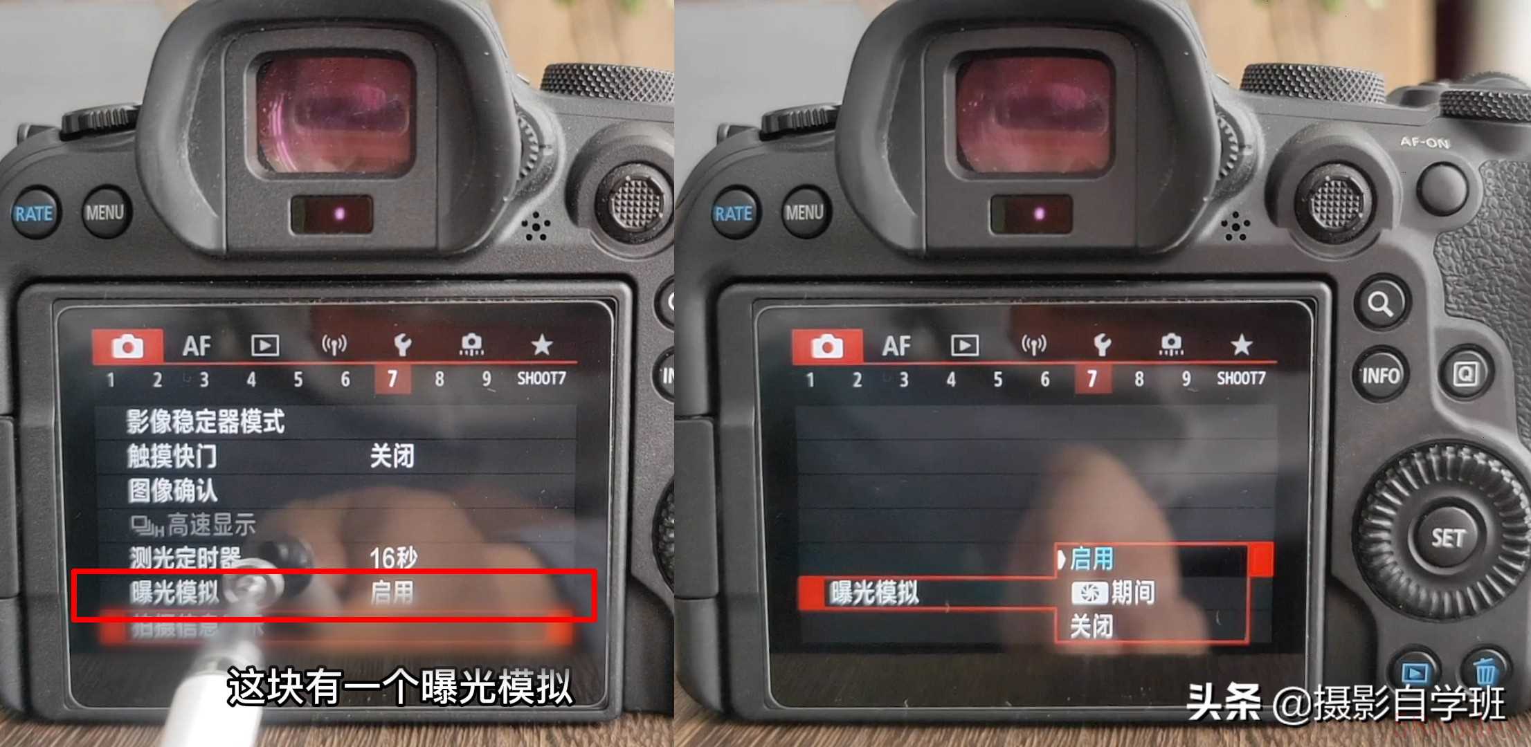 MENU设置中,第一层左一相机设置,点击7选项中,曝光模拟-启用。