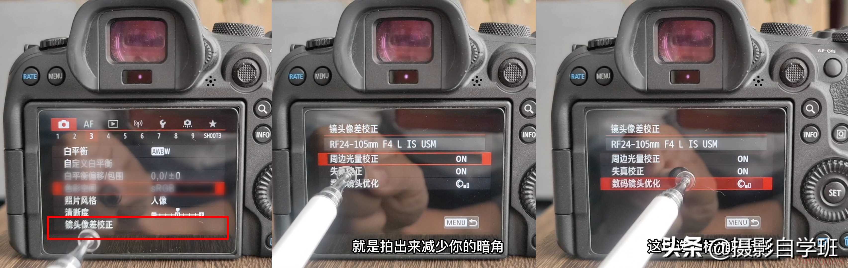 (1)MENU设置中,第一层左一相机设置,点击3选项中,镜头相差校正。