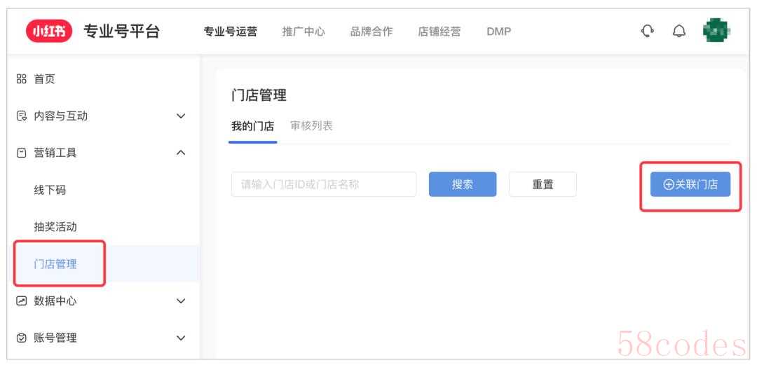 ■ STEP①:打开专业号平台(pro.xiaohongshu.com)— 「营销工具」—「门店管理」,选择「关联门店」