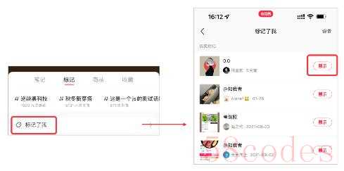 ○ 展示用户笔记:在主页选择【标记页】,点击「标记了我」,选择期望展示的用户笔记即可。