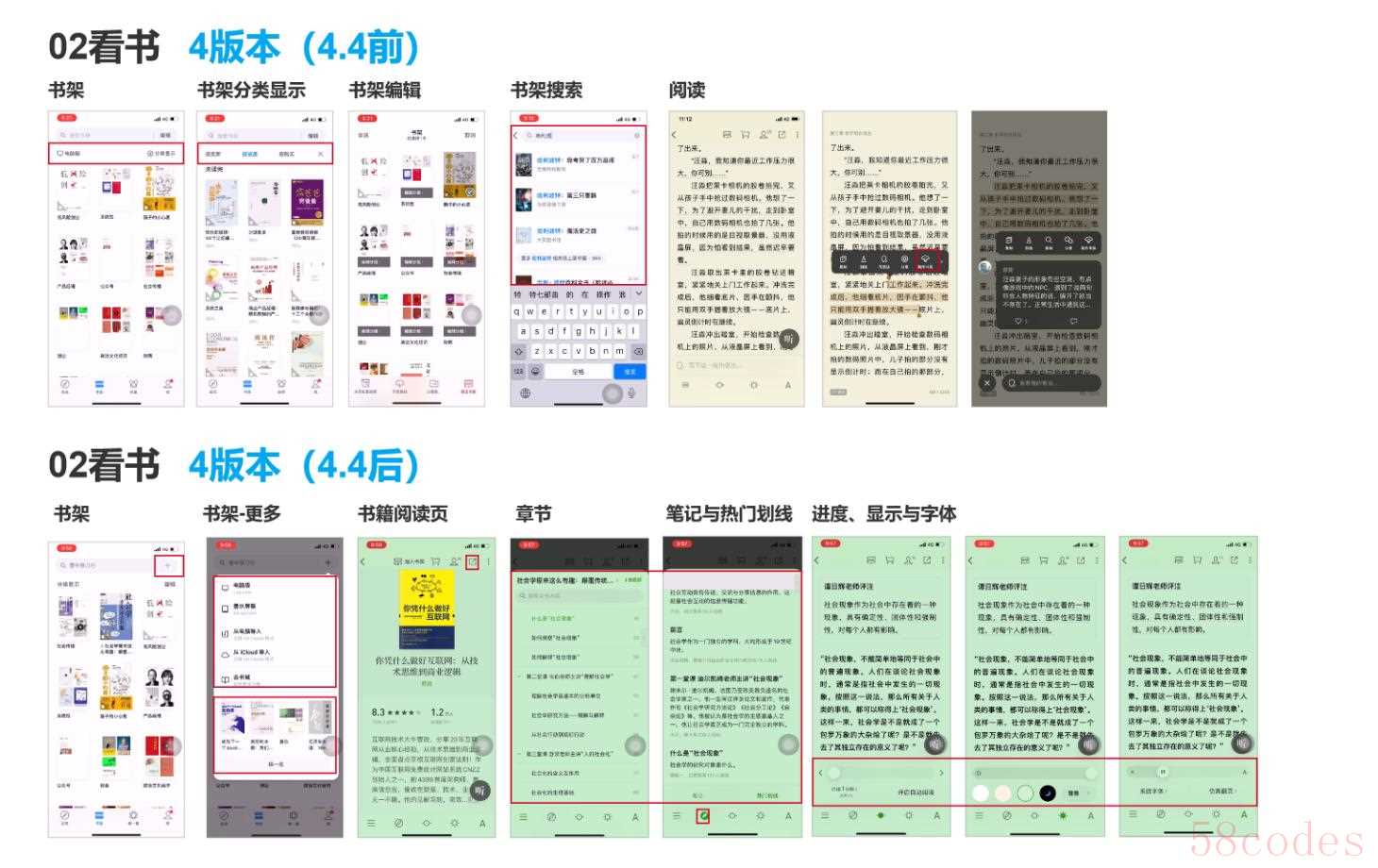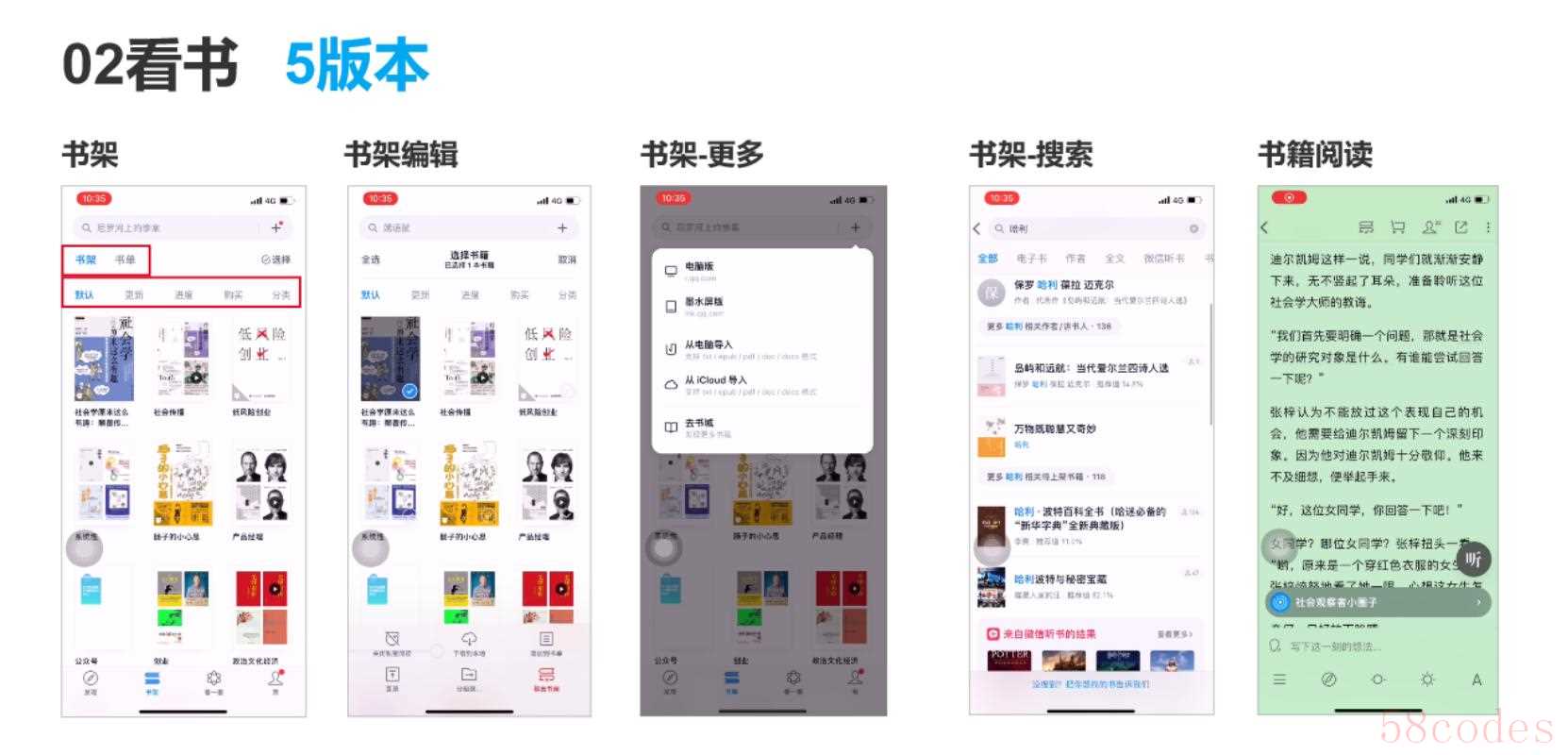 看书方面,书架和书单变为同一层级,分类直接展示,不再像4版本需要点击才可查看,更加高效。