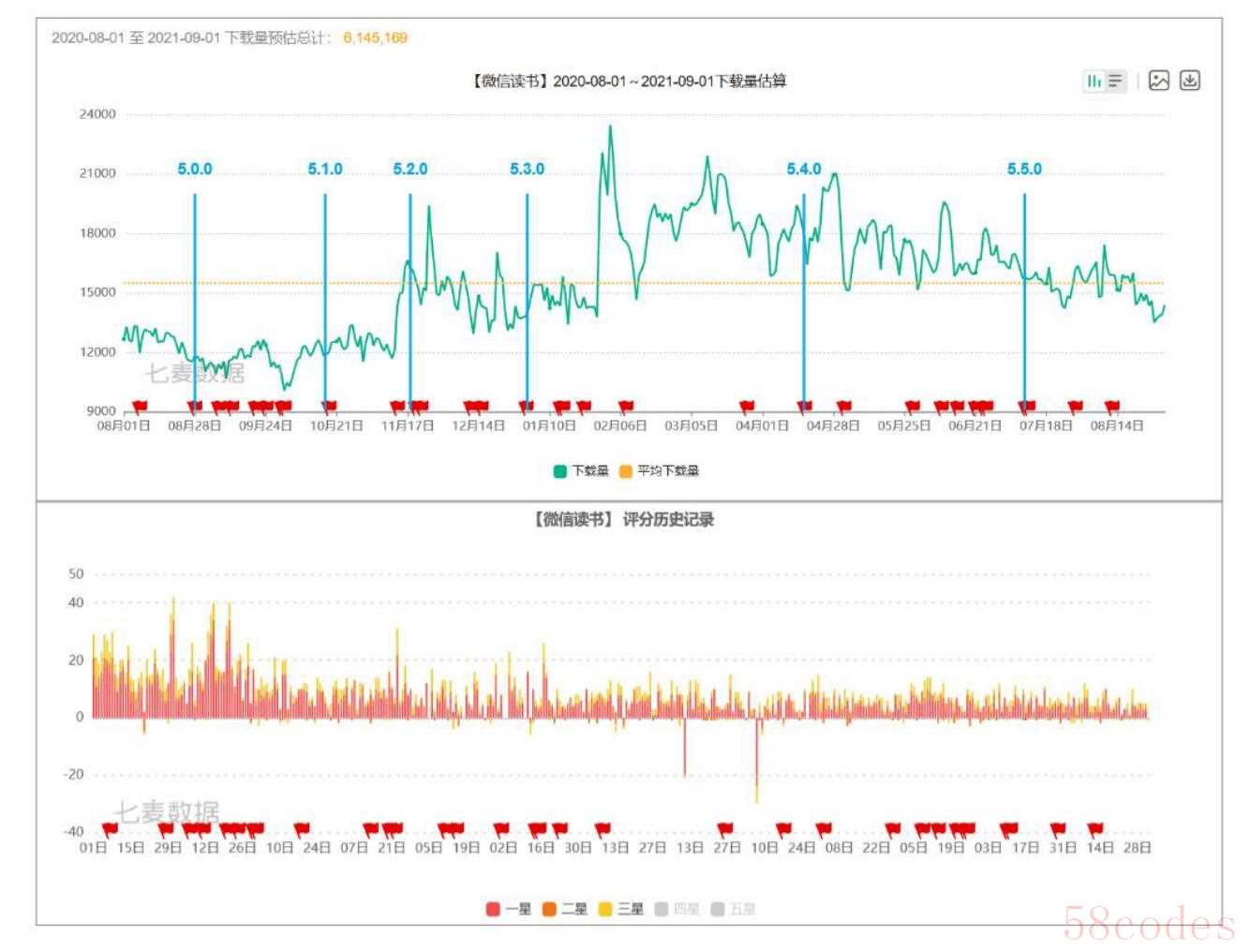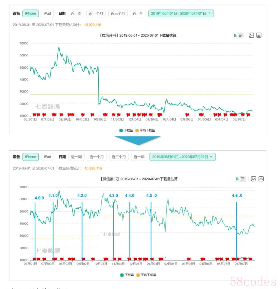 如下载所示,本数据来自七麦数据ios端的下载量可以看到,5.3版本后用户下载量上了一个台阶,5.4版本前后下载量都维持在版本平均线以上。