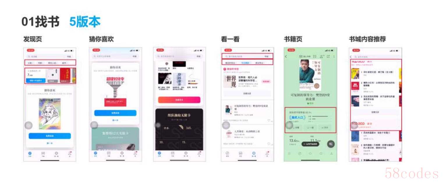 发现页,增加了书城分类的快速入口,如分类、书单等,直接展示一些关键的分类,促使用户点击,书籍查找的逻辑现在是很完善了,有直接目标需求的,可以通过查找进行精准化搜索,有大致方向的,可以通过类别入口进行查看,而漫无目的无目标的也可以通过分类和推荐卡片进行选取。