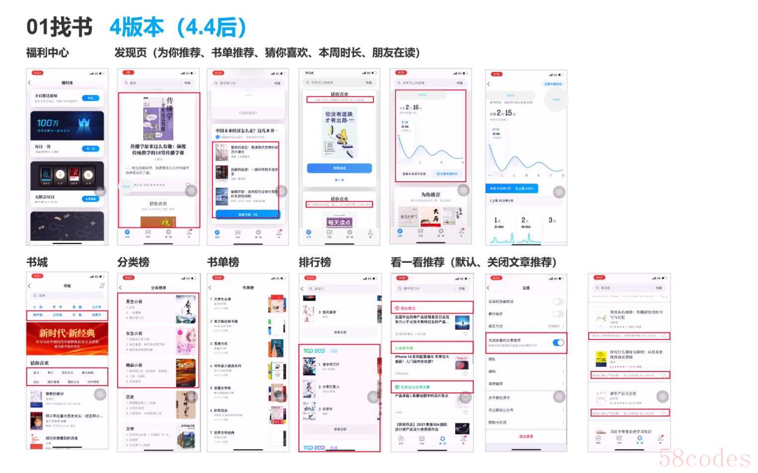 书城内部,榜单推荐也有了明显的偏向性,4版本过于推网络小说,信息展示优先级很高,在5版本则回归到 3 版本,内容推荐不再单一化,榜单千人千面。