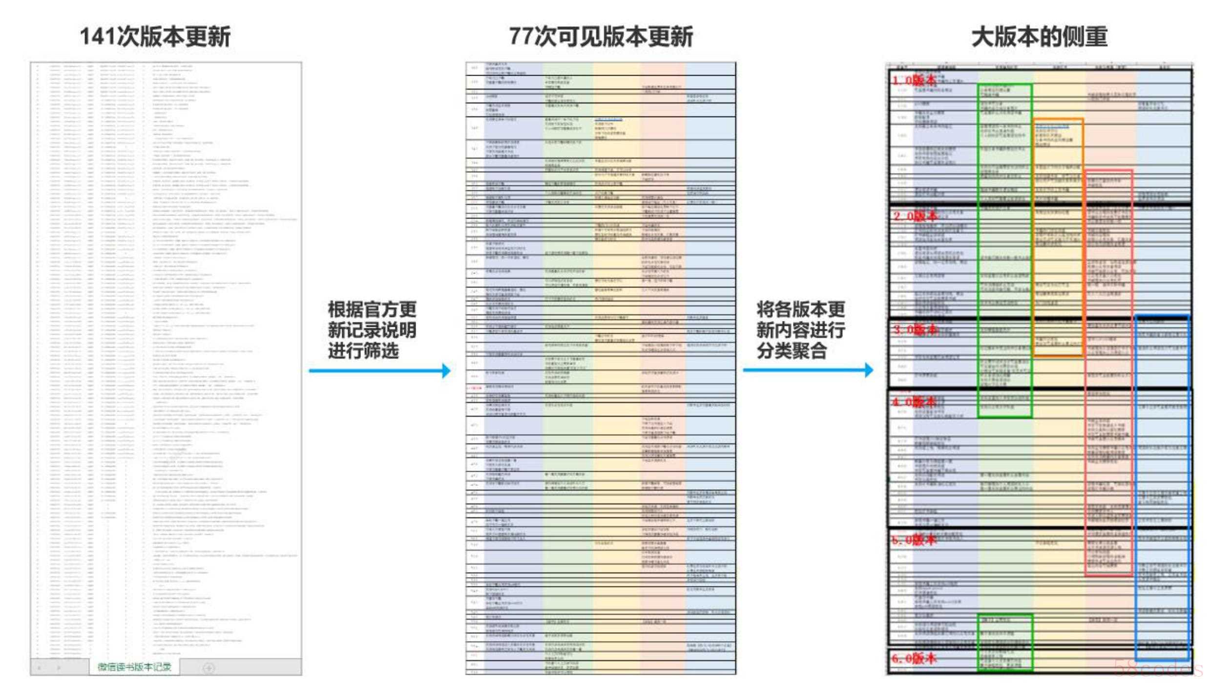 随后,我花费一定时间来对所有版本的内容进卡片分类,分为阅读体验更新、关系链及社区更新、内容衍生(UGC)、内容和推荐以及商业化五个大类。