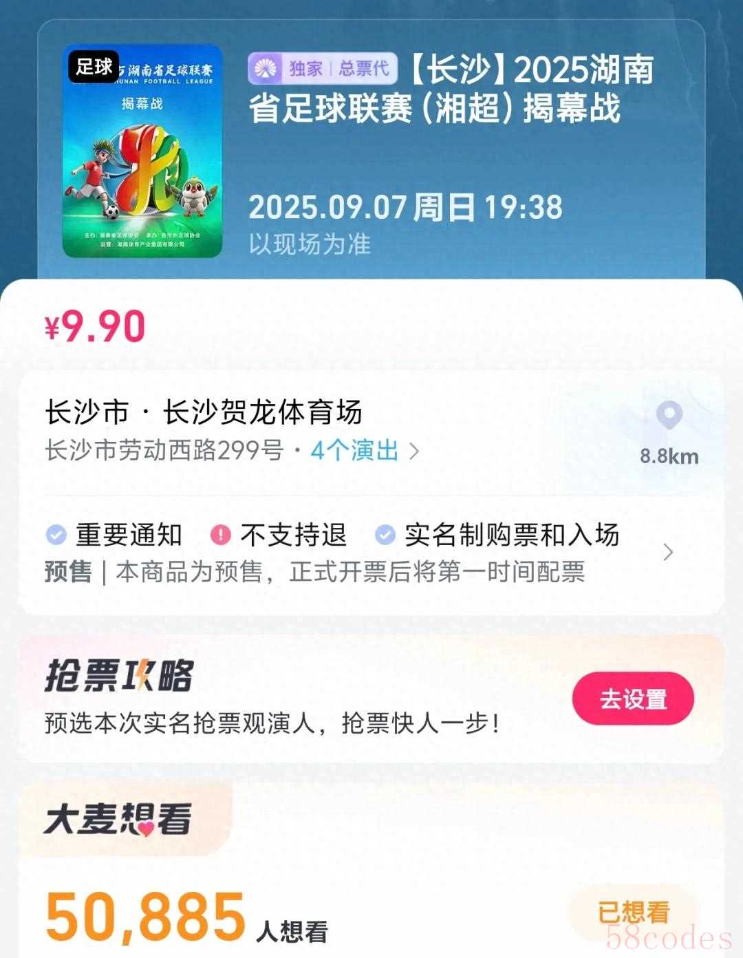 今天距离“湘超”揭幕战只剩6天截至今天16点35分已经有超过5万球迷在大麦网上预约揭幕战门票!