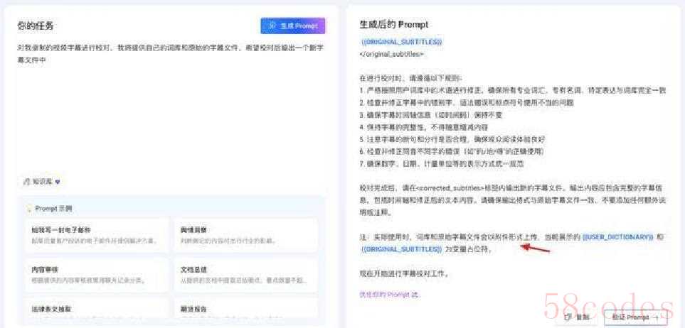 https://promptpilot.volcengine.com/home。定位更偏专业,做提示词生成和优化都挺全。举个常见场景:你要模型根据词库和字幕文件做校对,最后输出一个新文件。把需求和样例给它,它会生成一个结构化、具体、完整的提示词。生成的提示通常比较规整,有时还会把长输入用类似 xml 标签分隔,避免模型把指令和待处理内容混在一起。把变量位置留好后,业务端可以动态把词库、字幕文件等拼进去。