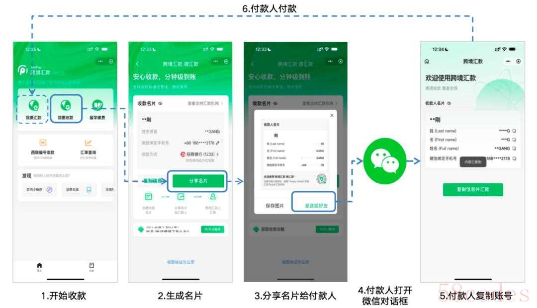 这个产品是微信生态内用户收款,它采用了分享名片的方式让海外用户通过第三方汇款应用来进行支付。