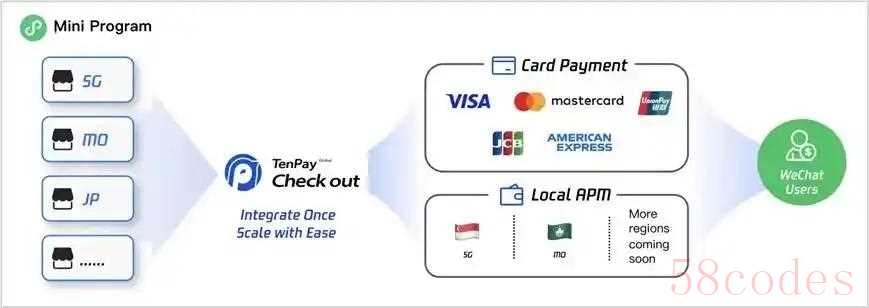 收单是最近微信重点推荐的核心产品,其中“全球收银台”就是围绕微信小程序这个核心优势产品,让境外商家通过微信生态来开展本地化收单业务,微信也把各种本地化支付方式集成到收银台上给当地用户使用。