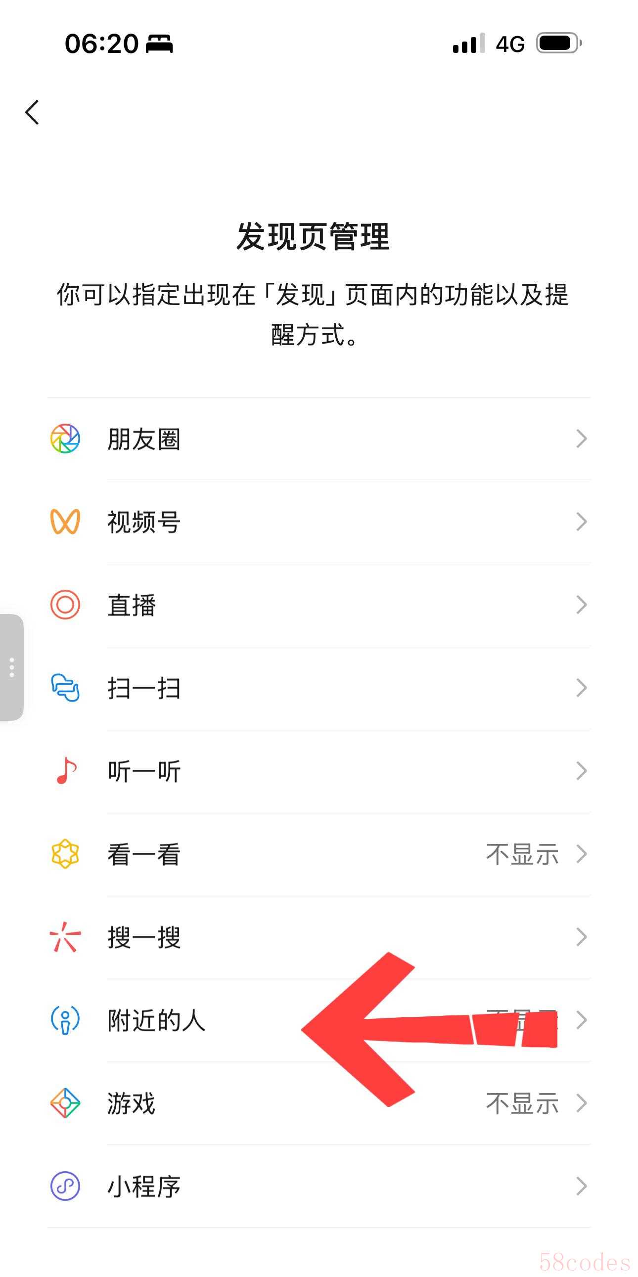 首先打开微信,点击右下角“我”,进入设置界面。找到“通用”选项,点击进入后找到“发现页管理”,在里面找到“附近”功能,将其所有开关全部关闭。