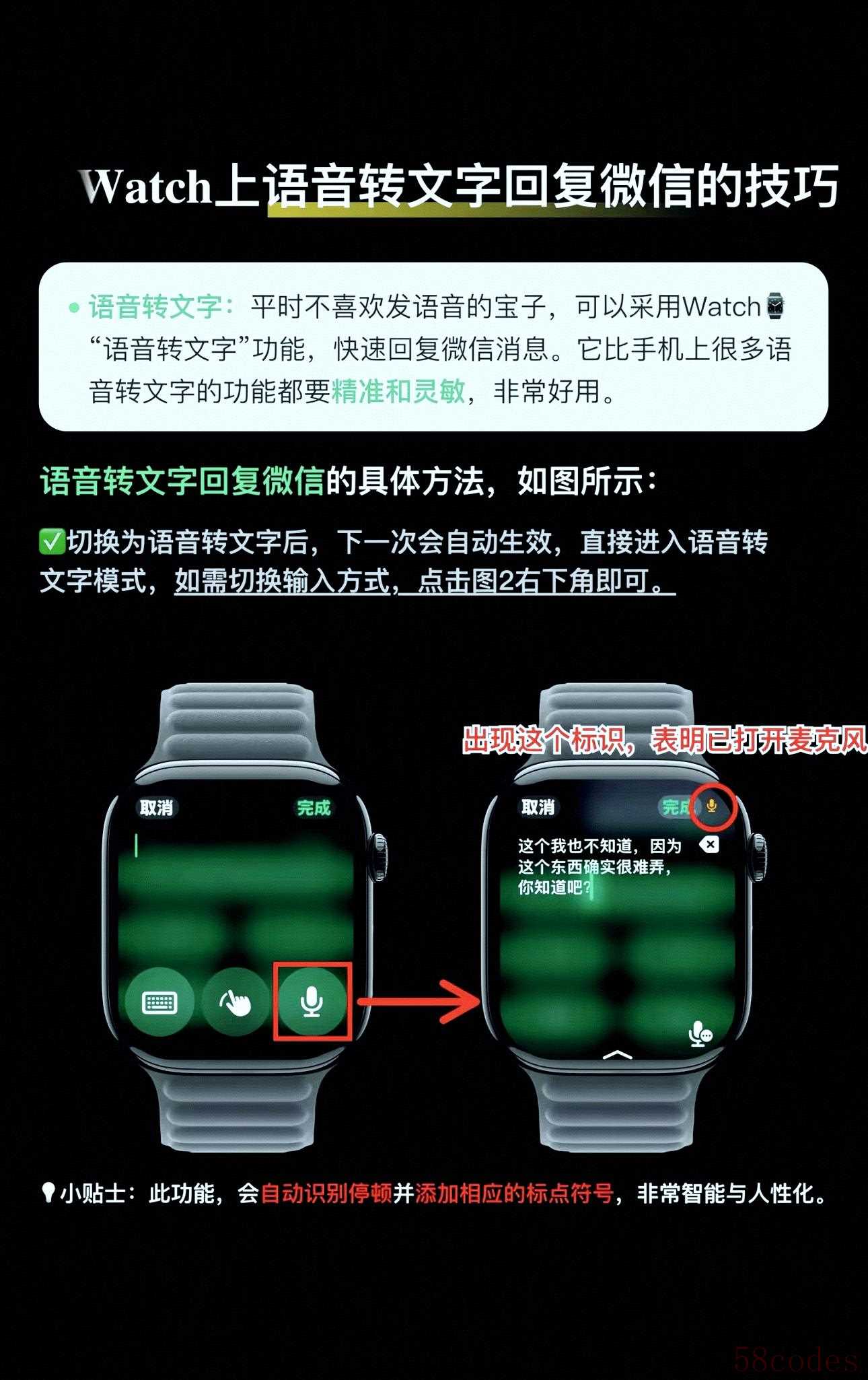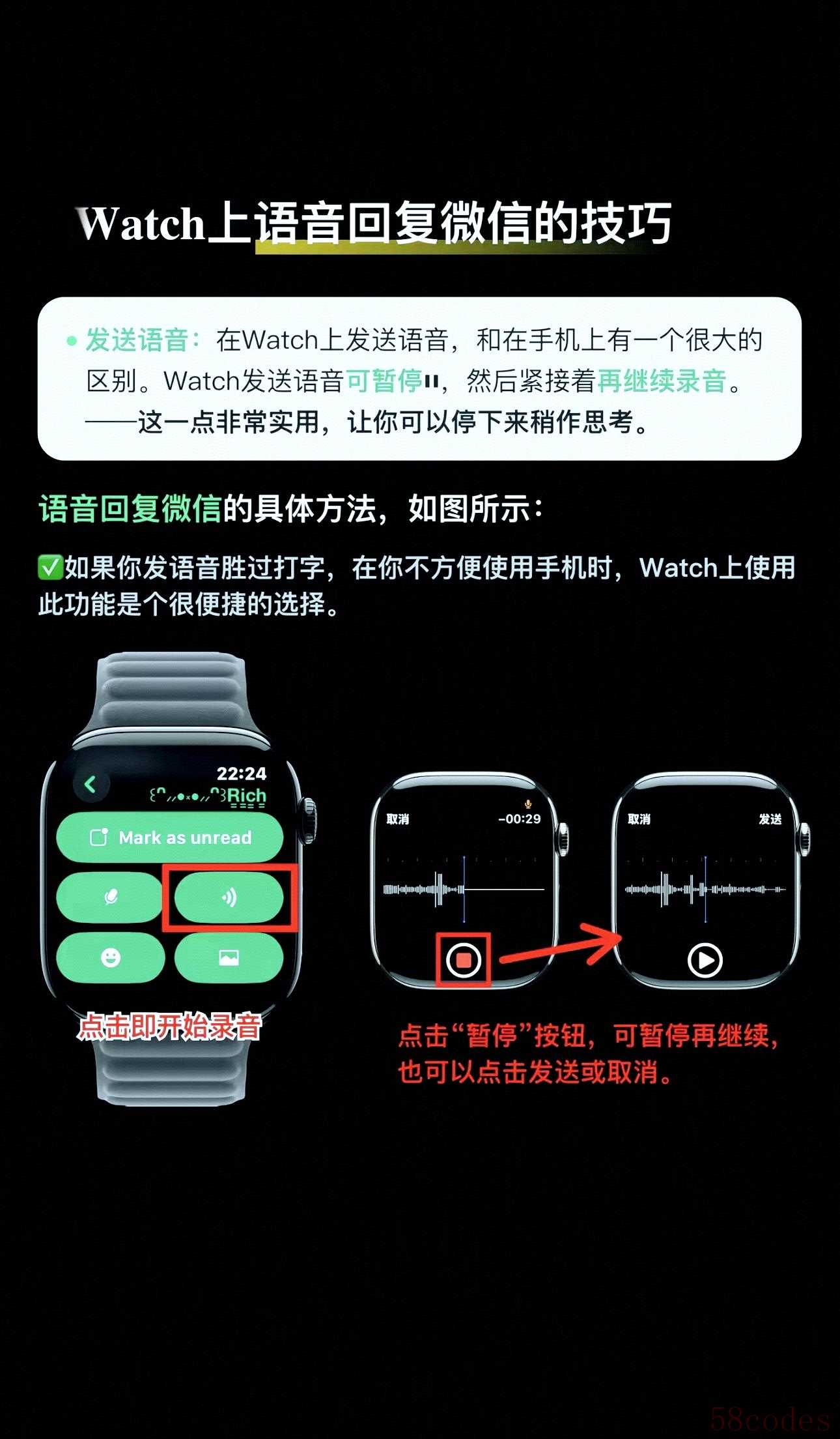 "语音回复:" 在锁屏界面或手表界面收到微信消息时,直接说“语音回复”或长按侧边按钮,即可启动语音输入,说出你的回复内容。