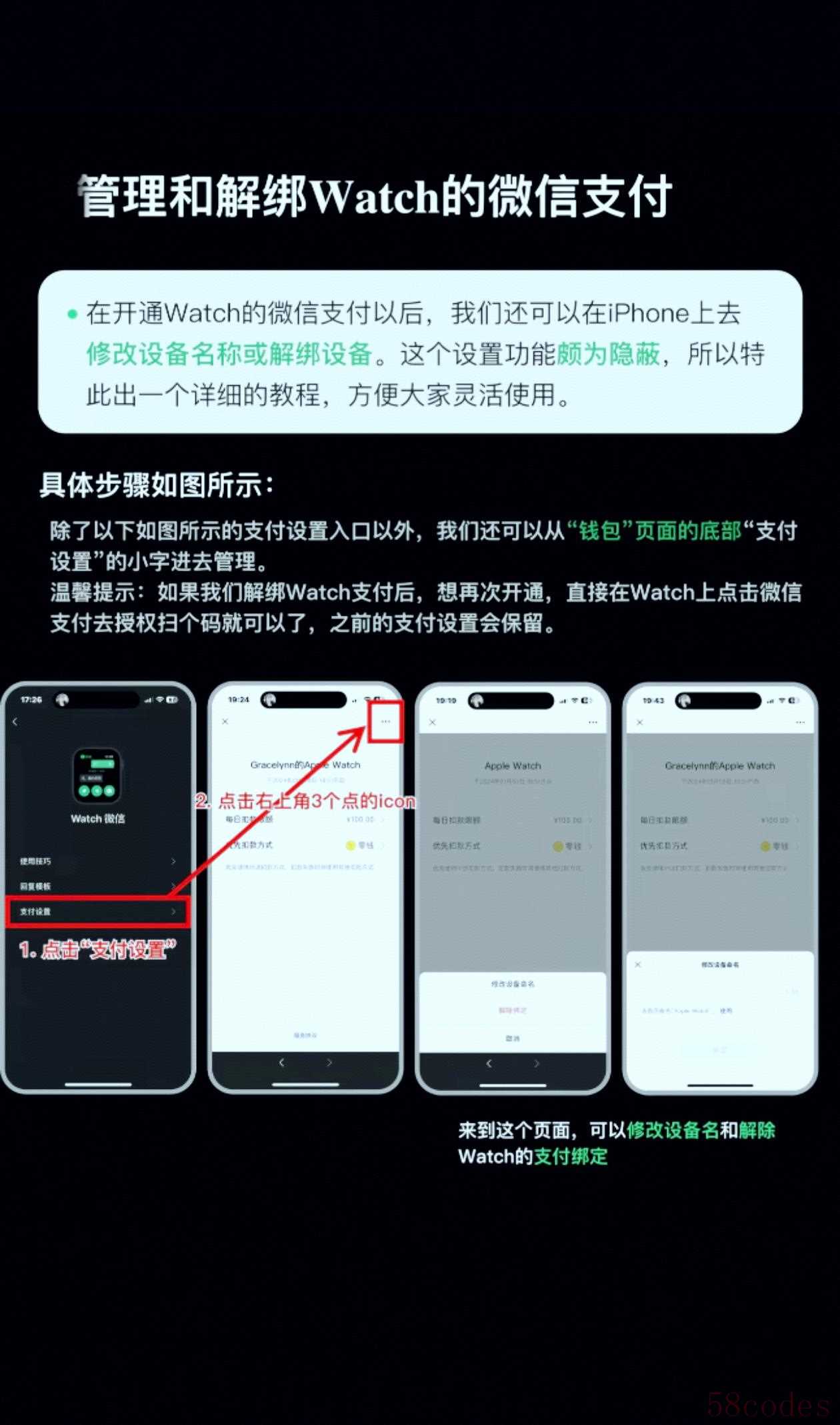 要是你担心安全问题,想对支付进行管理,也很简单。在 iPhone 微信的“设置 - 设备 - 支付设置”(或者钱包页面底部的小字处),就能轻松修改设备名称,或者解绑 Apple Watch 支付。要是之后又想重新开通,扫个码授权就行,之前设置好的支付额度等信息,全部都会保留,不用再重新配置。