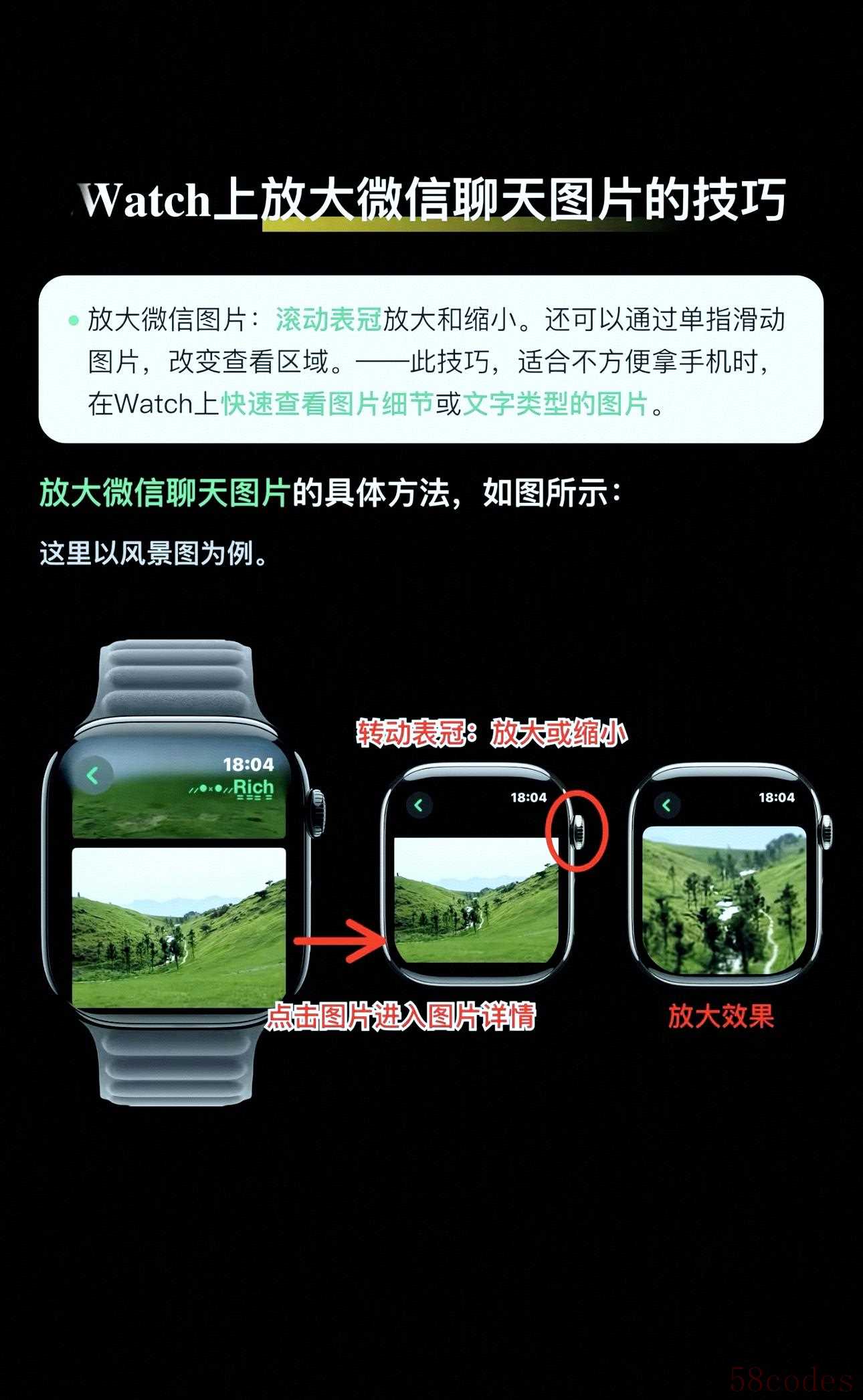 有时候收到那种文字图片或者二维码,在手表上看不清咋办?别急,这就有妙招!只要滚动表冠,就能轻松放大缩小图片,再用单指滑动,还能调整查看区域,也能精准读取图片里的信息。
