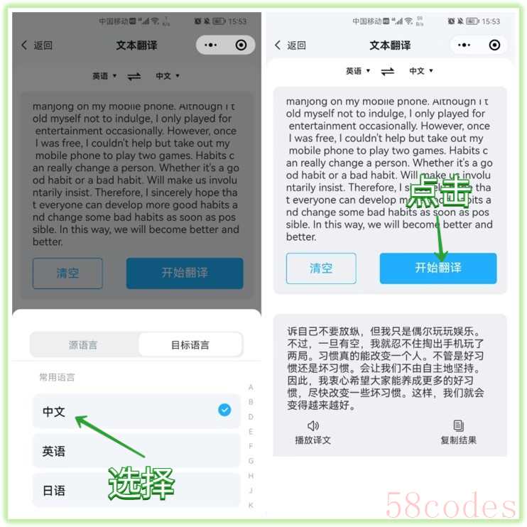 4.除了拍照翻译,还有一个「文本翻译」功能,在文字粘贴进去,选择识别语言和目标语言,点击「开始翻译」,下方就会出现翻译结果。