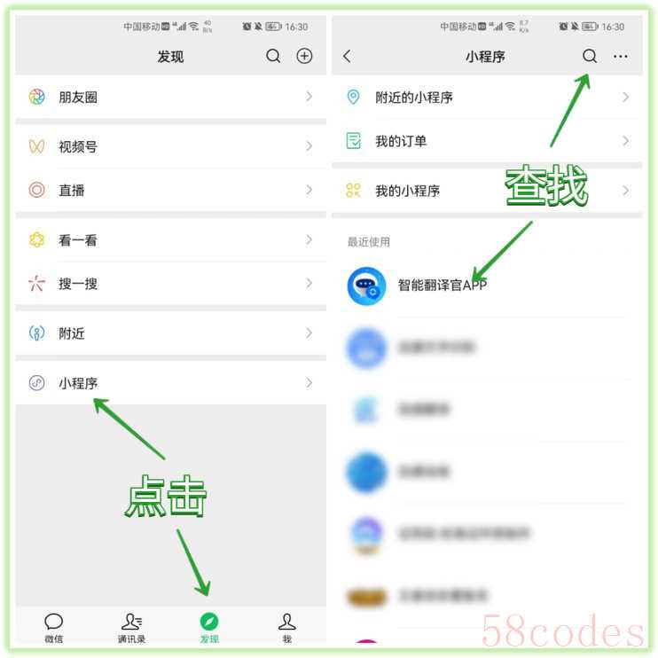 二、智能翻译工具1.如果你觉得这样太麻烦了,可以点击微信底部的「发现」,进入「小程序」功能中,通过右上角的“放大镜”,查找“智能翻译官”。