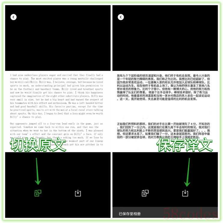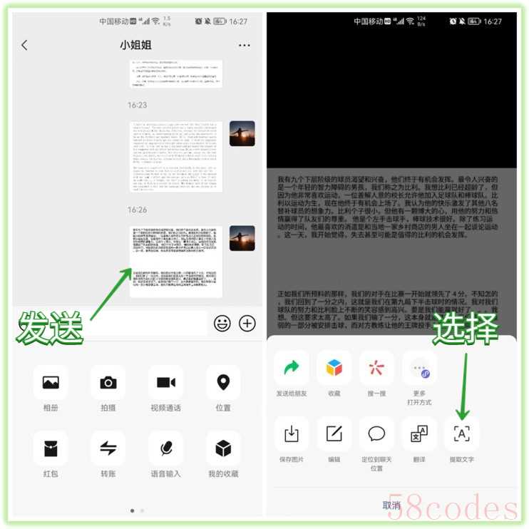 3.需要注意的是,只能保存为图片,想要提取翻译结果,你可以将图片发送给微信好友,然后打开图片长按2秒,选择「提取文字」功能。