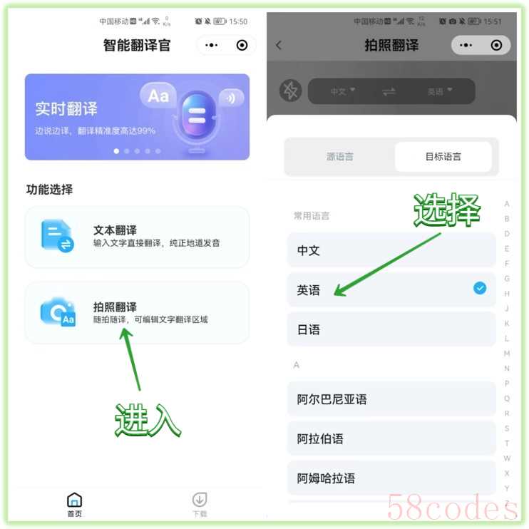 2.进入这个工具首页,将会看到有2种翻译功能,点击「拍照翻译」,先选择一种识别语言,再选择一种翻译语言,将镜头对准纸质文档。