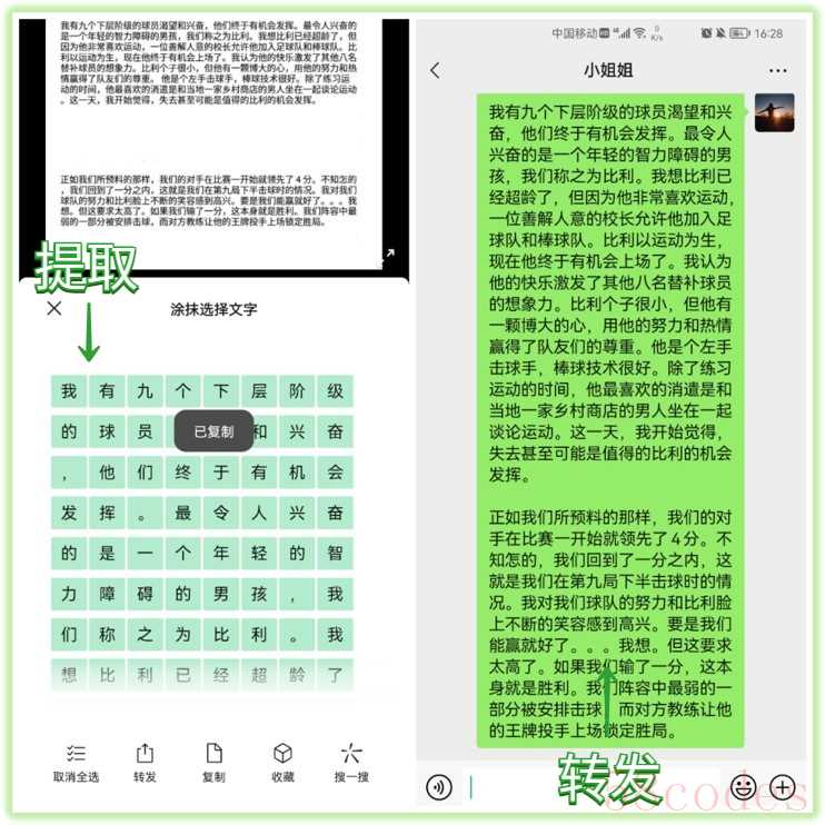 4.仅需1秒钟,就能将图片上的文字提取出来了,通过涂抹文字或全选,进行转发、复制、收藏、搜索,这样我们就可以获得翻译文稿了。