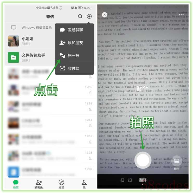 一、微信扫描翻译1.首先我们打开微信首页,点击右上角的“+”号,选择「扫一扫」,进入后切换到“翻译”功能,将镜头对正英语文稿,按下快门键拍照。