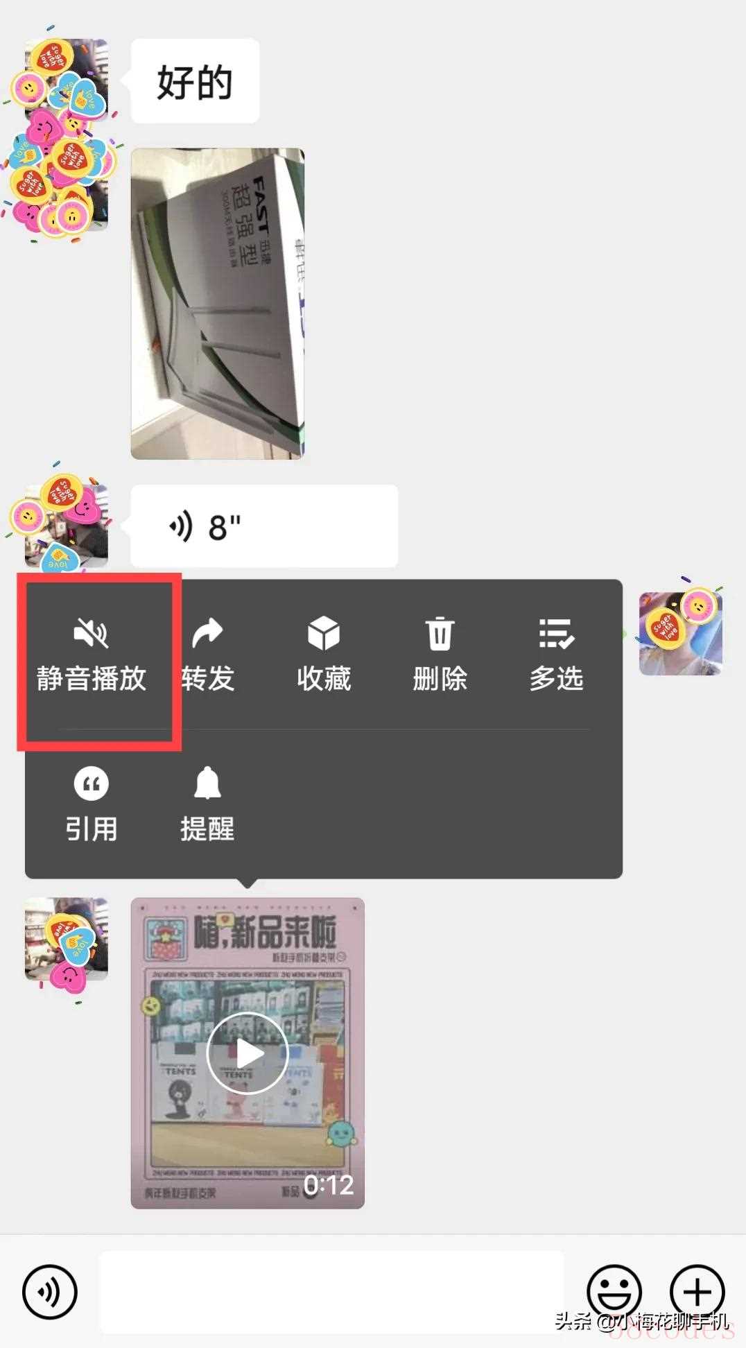 2.视频静音播放,平时对方给我们发来很好玩的视频,但我们在一个不合适声音外放的情况,又很想看这个视频怎么办呢?我们只需长按这个视频2秒钟,就如图所示