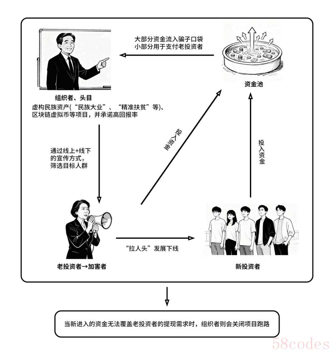 这类型的骗局通过“高额回报”吸引用户的注意力,同时鼓励用户“拉人头”发展他人成为自己的下线,以此获取更多收益。当拉人的资金不足以支付上线的收益时,资金链就会断裂,组织团伙便会迅速卷款跑路,参与者将面临资金损失和信息泄露双重风险。