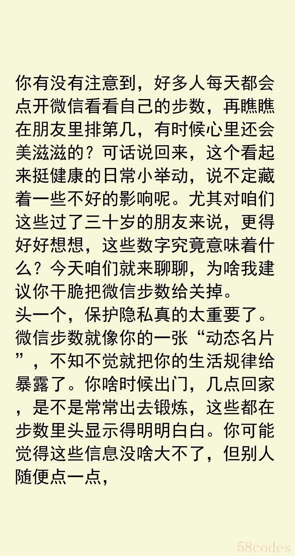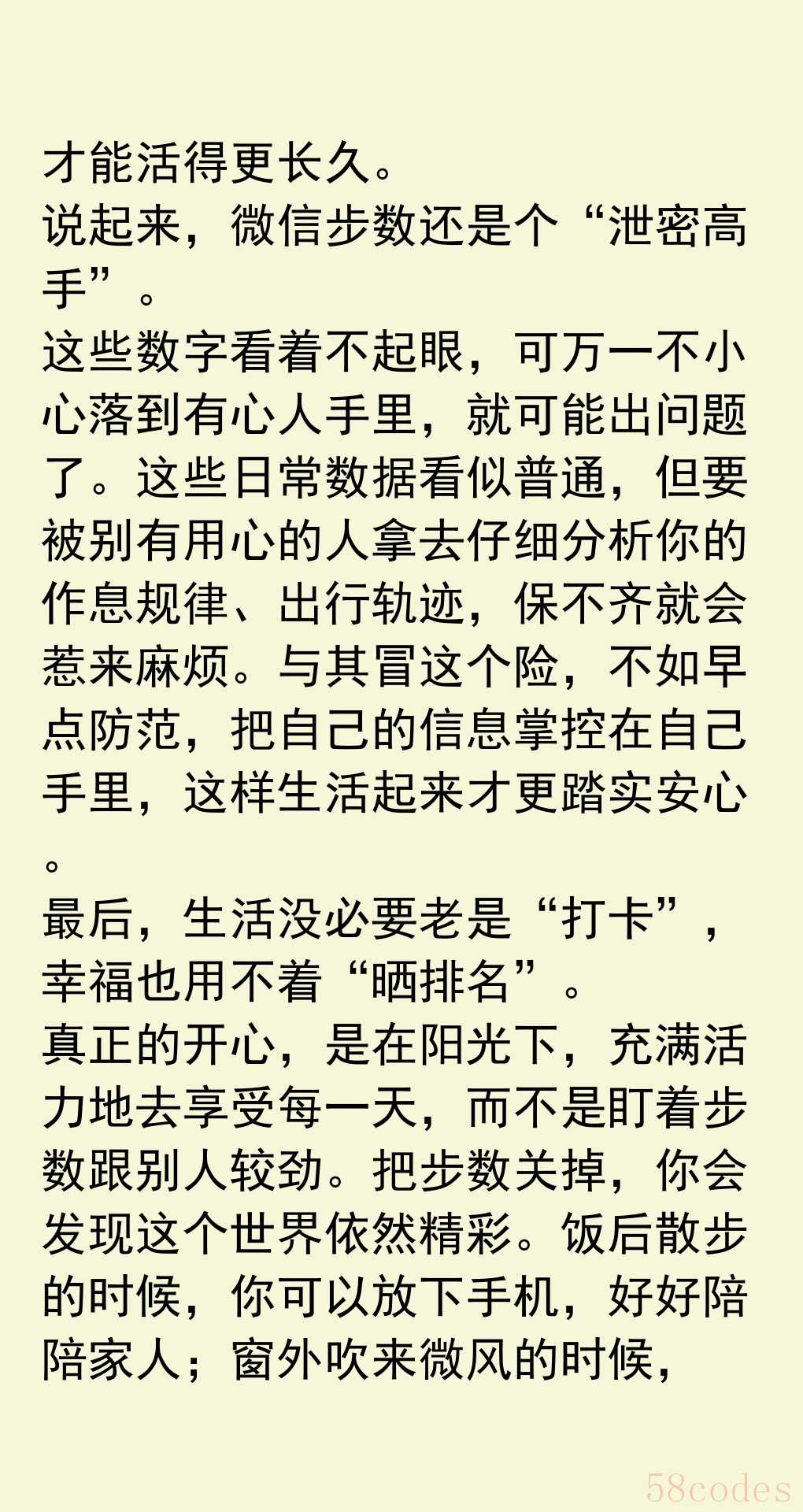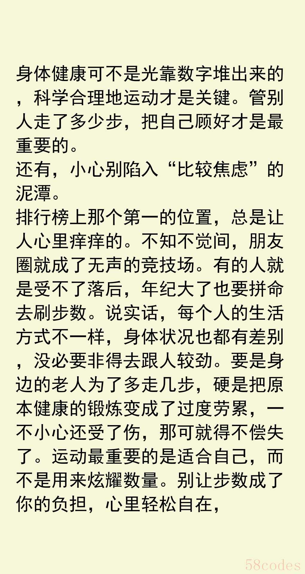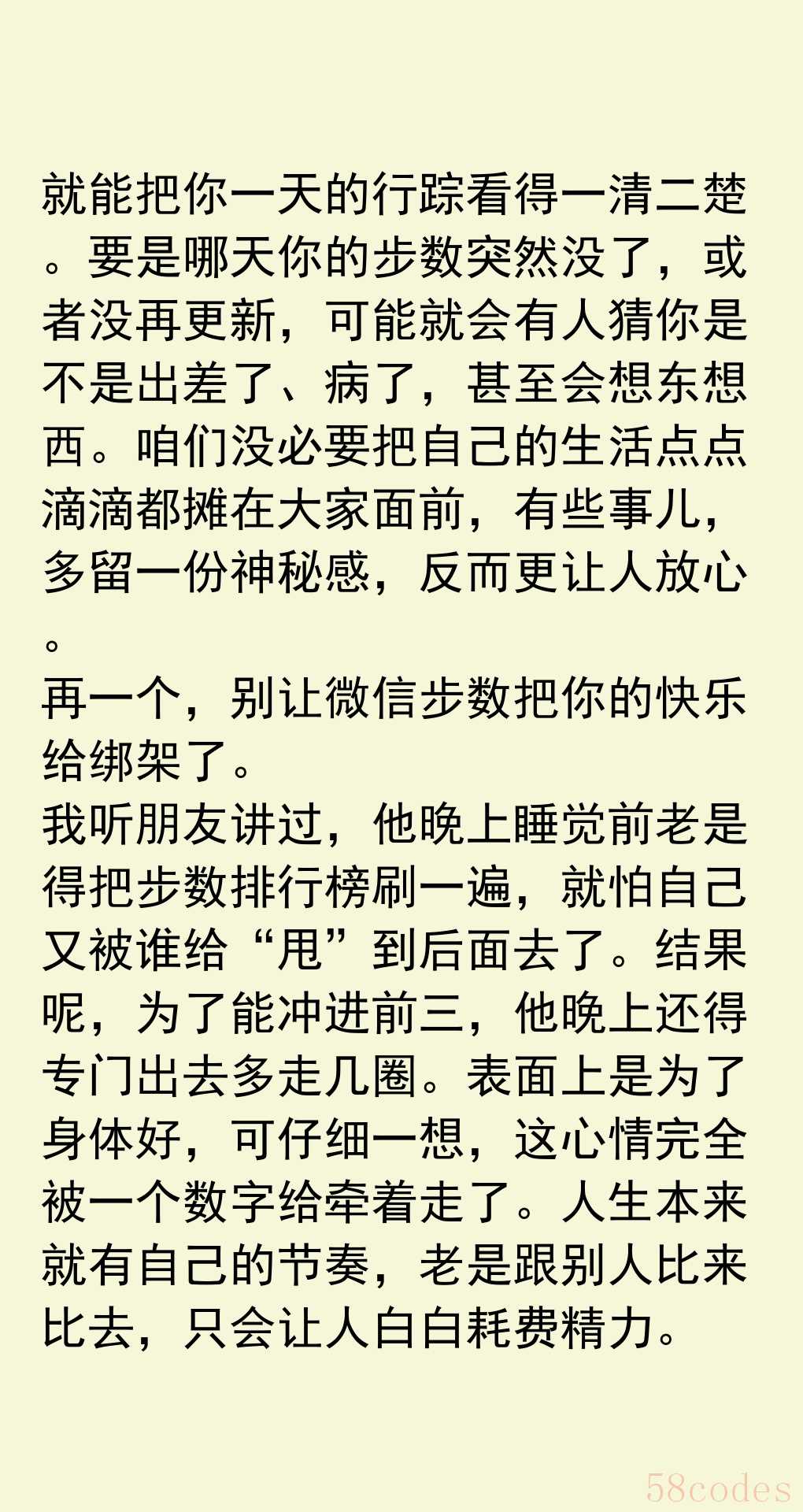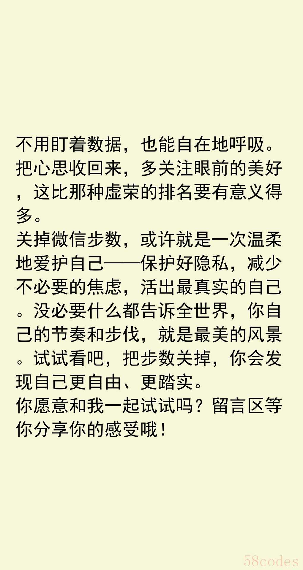 亲爱的朋友们,你是不是也每天打开微信步数,习惯性地刷一下朋友圈的排名?看到自己名列前茅时,心里是不是也悄悄得意一下?这个看似健康的小习惯,对于我们30岁以后的生活,可能并非全然是益处,甚至埋藏着一些不必要的“内耗”。它无形中泄露了我们的作息轨迹,让我们的生活少了几分神秘和安全感。更重要的是,我们很容易被那份排名绑架了心情。为了挤进前几名,我们可能过度运动,甚至让身体背负不必要的压力,陷入无止尽的比较焦虑。真正的健康是适合自己的节奏,真正的幸福是享受当下,而不是在数字中寻找虚荣的成就感。所以,我真心建议你,不妨“果断”关掉微信步数。让生活回归它本来的样子,把注意力从虚假的排名拉回到真实的自我。你会发现,放下比较,我们能更自由地呼吸,更安心地享受每一刻。你愿意放下这份数字的“束缚”,找回内心的平静吗?留言区等你的故事!