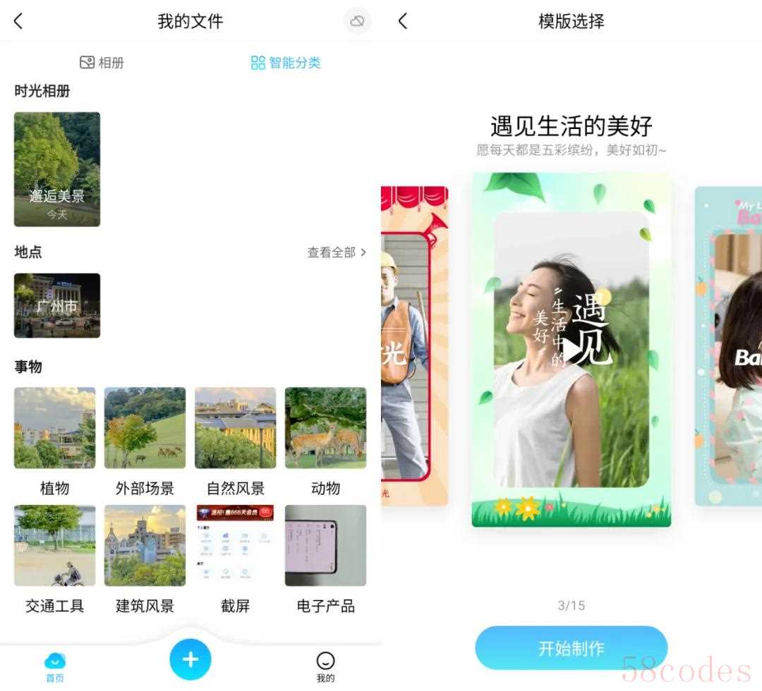 主要功能为上传图片、视频,WiFi 下自动备份、图片智能分类以及套用模板生成小视频。