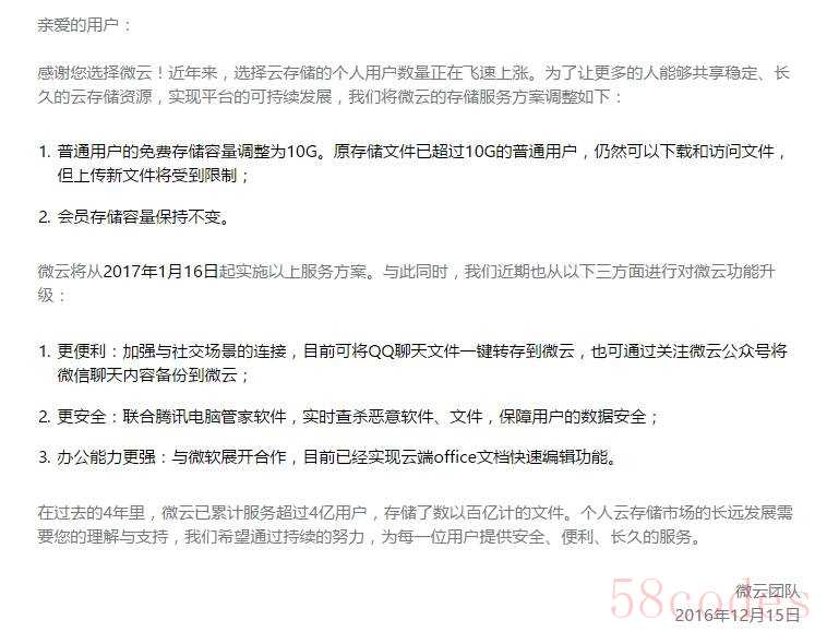 12月15日晚间,腾讯微云突然发布调整服务公告,称普通用户的免费存储容量缩小为10G,原存储文件已超过10G的普通用户,仍然可以下载和访问文件,但上传新文件将受到限制。