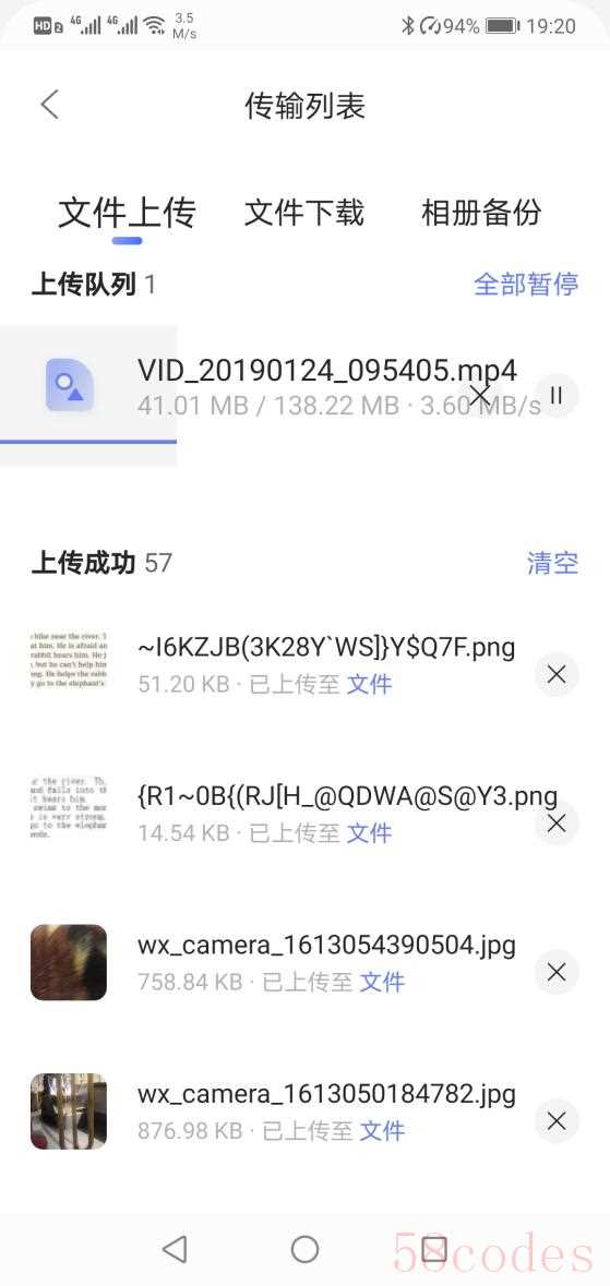 阿里云盘目前并没有提供PC客户端,在手机上可以安装客户端与网盘文件实现同步。不过与上面网盘不同的是,目前阿里云盘在公测期间主推上传/下载不限速。比如手机用户在安装阿里云盘客户端后,点击“文件→+”,然后选择需要上传的文件,在100Mbps的宽带条件下,实测上传速度达到3.5MB/s,下载则达到7MB/s,这个表现要远远比其他网盘优秀,对于经常需要在不同设备上同步大文件的用户来说,使用起来极为便利(图6)。